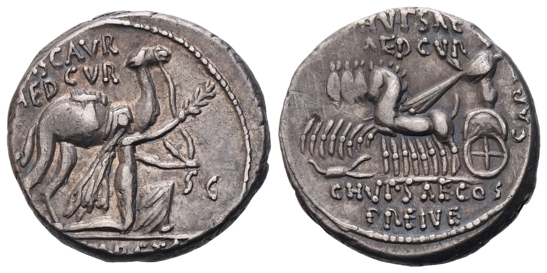King Aretas kneeling to r., holding palm branch in his r. hand and reins of a camel standing r. behind him in his l.; above, [M]·SCAVR / AED·CVR; on either side, [EX] / SC; [REX·]ARETA[S] in exergue; Rv. Jupiter in quadriga to l.; below, scorpion to r.; above, [P·]HYPSAE / AED CVR; on r., CAP[TV] upwards; in exergue, [C·HYPSAE·COS / PREIVE. Crawford 422/1b; Babelon (Aemilia) 8, (Plautia) 8; Sydenham 913. Near extremely fine.