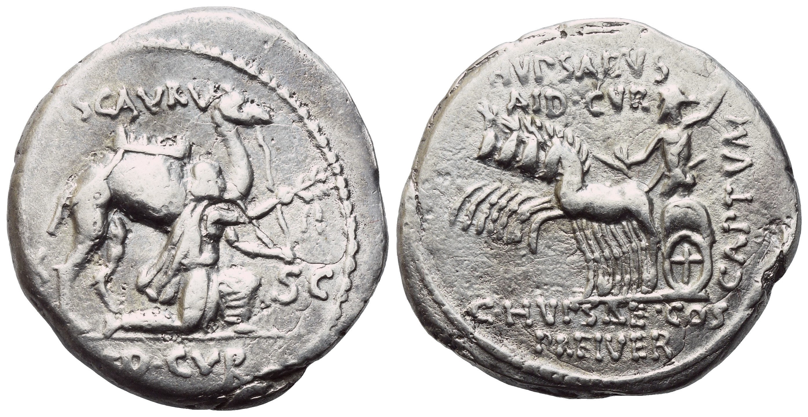 M SCAVRV above, AED CVR in exergue, [E]X - SC on either side, King Aretas kneeling beside camel r., offering olive branch; Rv.  [P] HVPSAEVS / AID (sic!) CVR above, CHVPSAE COS / PREIVER in exergue, CAPTV on r., Jupiter driving quadriga l. Crawford 422/1a var. (AID); Sydenham 912 var. (AID); RSC Aemilia 9 var. (AID). gVF / aEF
