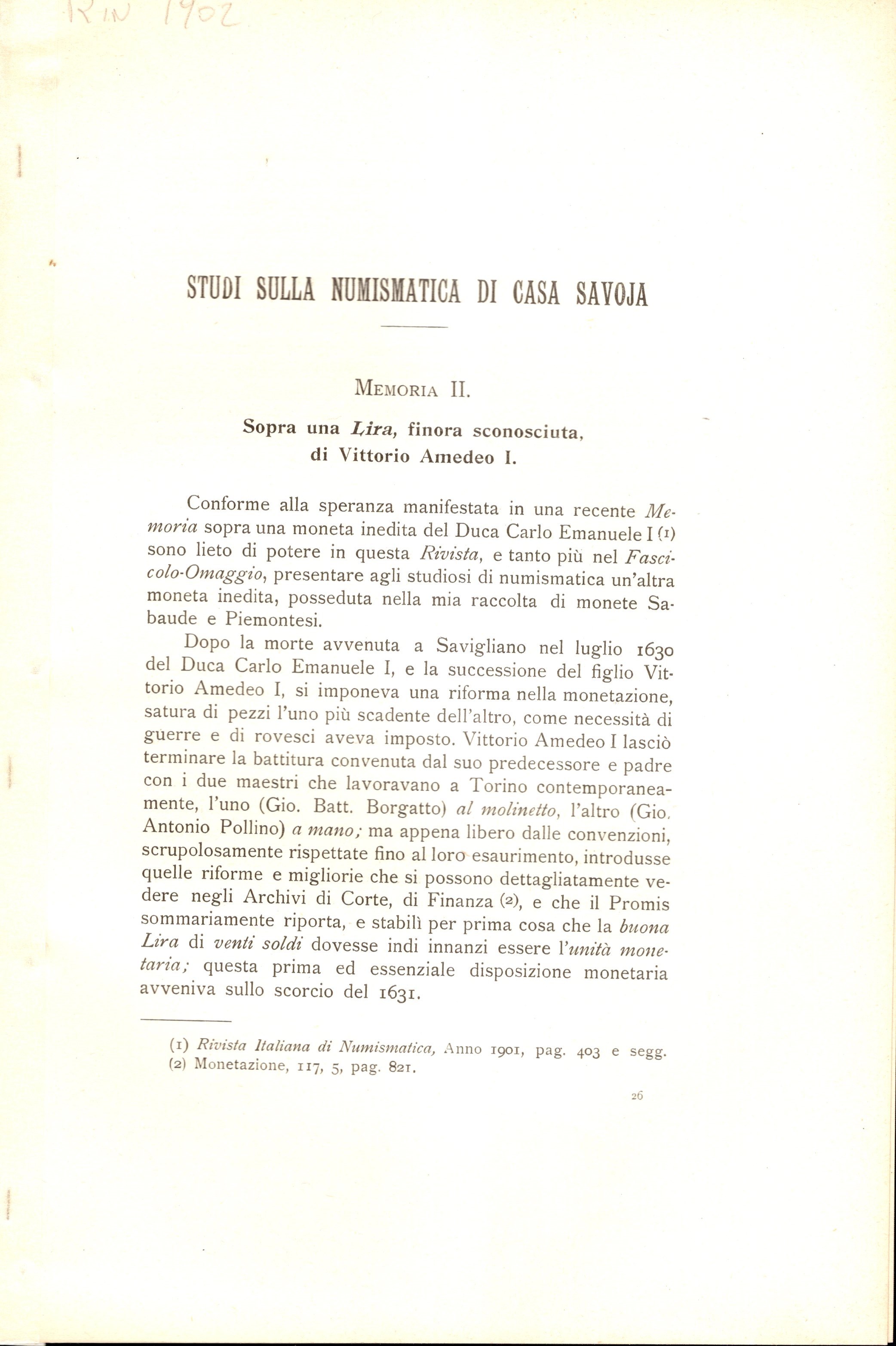 MARCHISIO A.F. - Studi sulla numismatica di Casa Savoja; Sopra una Lira, finora sconosciuta di Vittorio Amedeo I. Milano, 1902. pp. 205-210, illustrazioni nel testo. Brossura ed buono stato, raro.