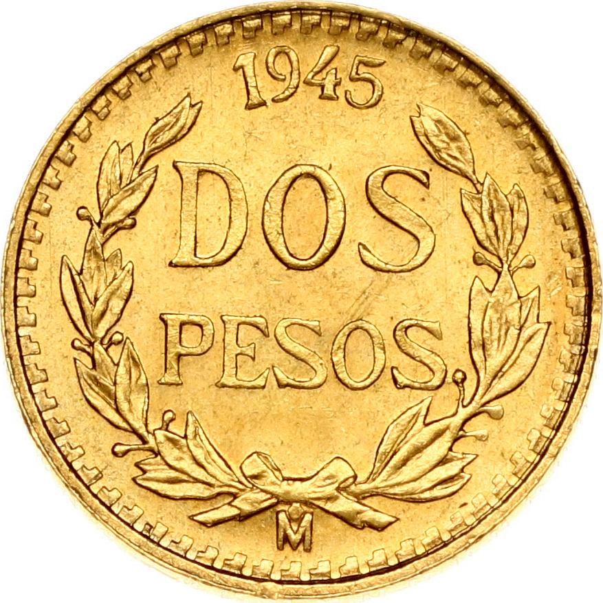 Mexico 2 Pesos 1945 Obverse: National arms. Reverse: Date above value within wreath. Gold 1.65g...