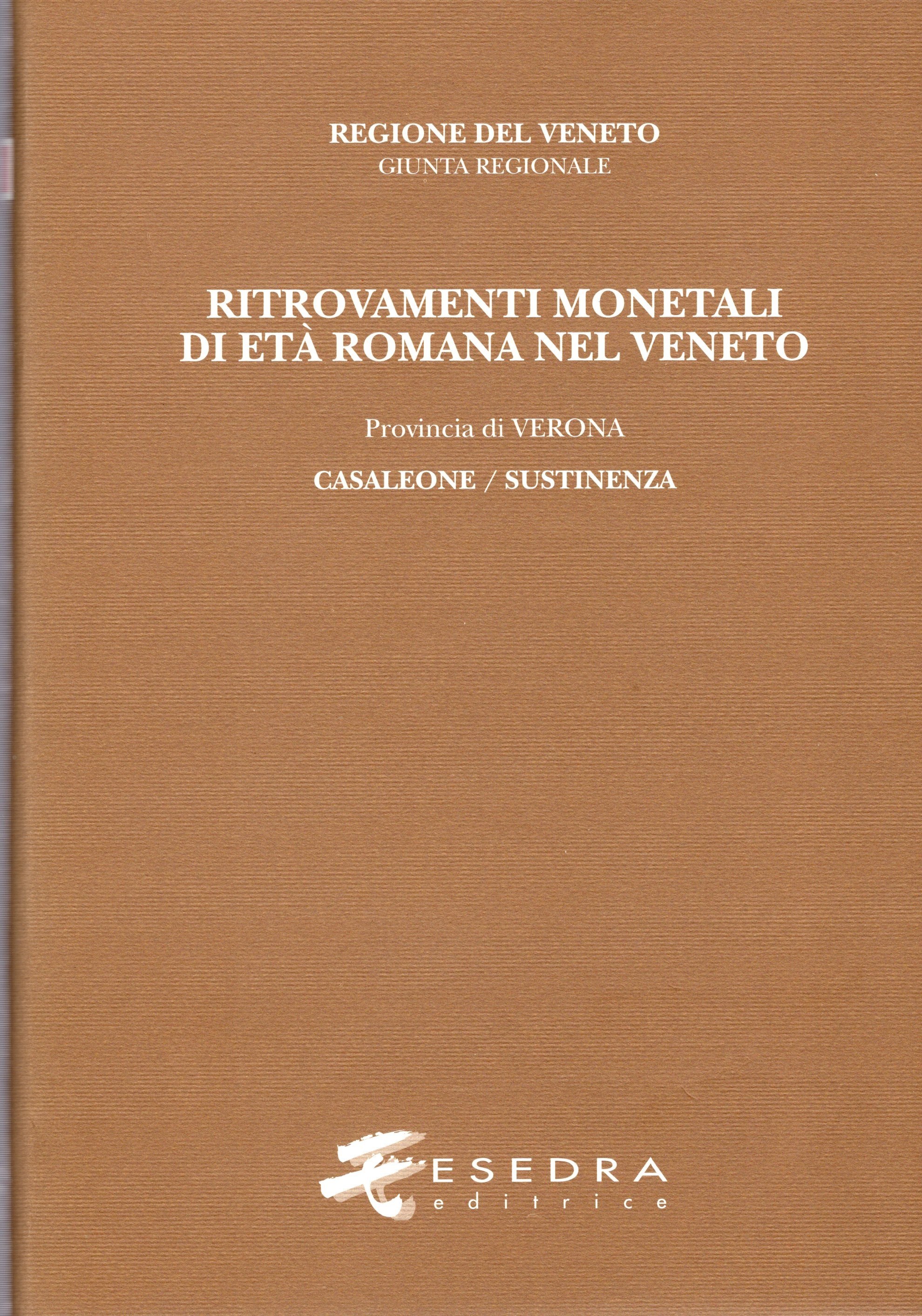 MODONESI D. - Ritrovamenti monetali di età romana nel Veneto. Provincia III: Verona. Comune di Casaleone \ Sustinenza. Padova, 2001. pp xiii -142, tavv. 90 + 1. rilegatura editoriale, ottimo stato. volume importante per due ripostigli di 2140 monete repubblicane tutte illustrate.