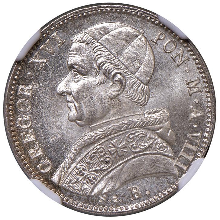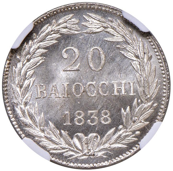 Gregorio XVI (1831-1846) Bologna - 20 Baiocchi 1838 An. VIII - Nomisma 456 AG R TOP POP, miglior esemplare certificato NGC, in slab MS 67+ n° 6635368-002. Nell'asta Nomisma 68 del 2023 un esemplare in slab MS 66 ha realizzato € 800 + diritti.