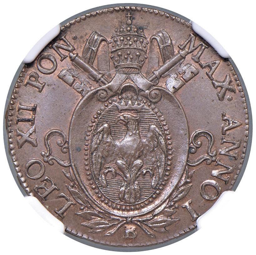 Leone XII (1823-1829) Bologna - Mezzo baiocco 1824 A. I - Nomisma 321 CU In slab NGC MS 66 BN cod. 3160269-010. Top pop, miglior esemplare certificato NGC