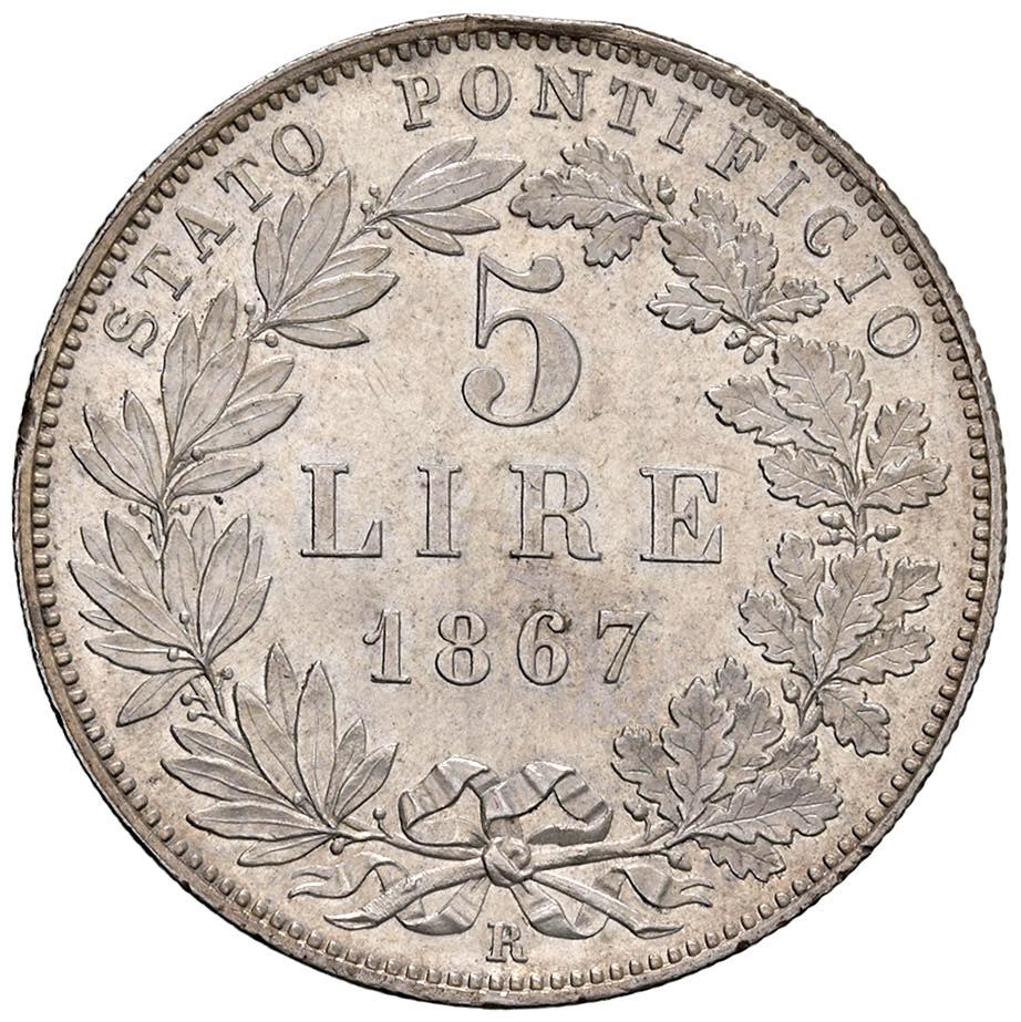 Papal coins - Pio IX (1846-1878) 5 Lire 1867 An. XXI - Munt. 45 ...