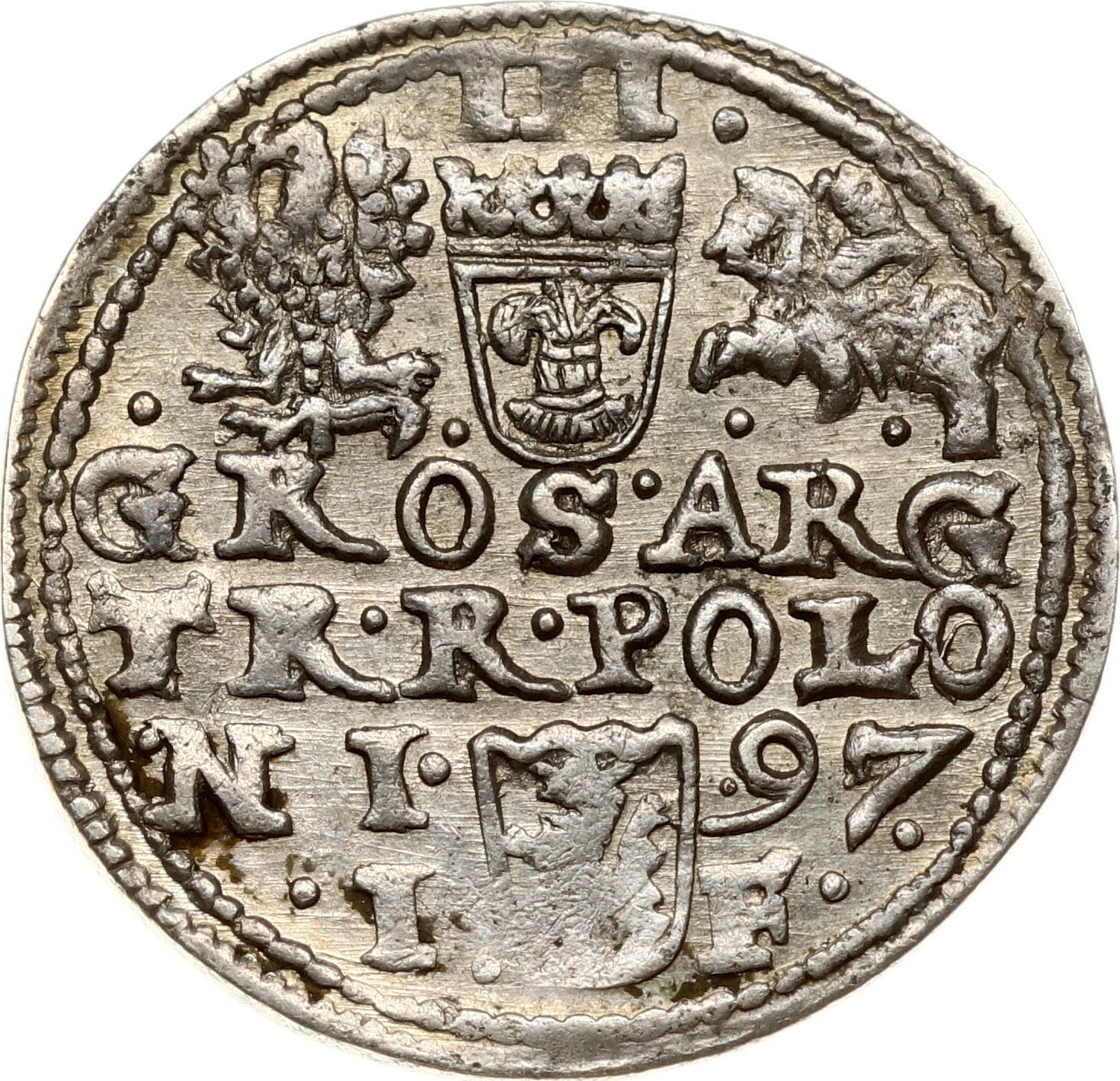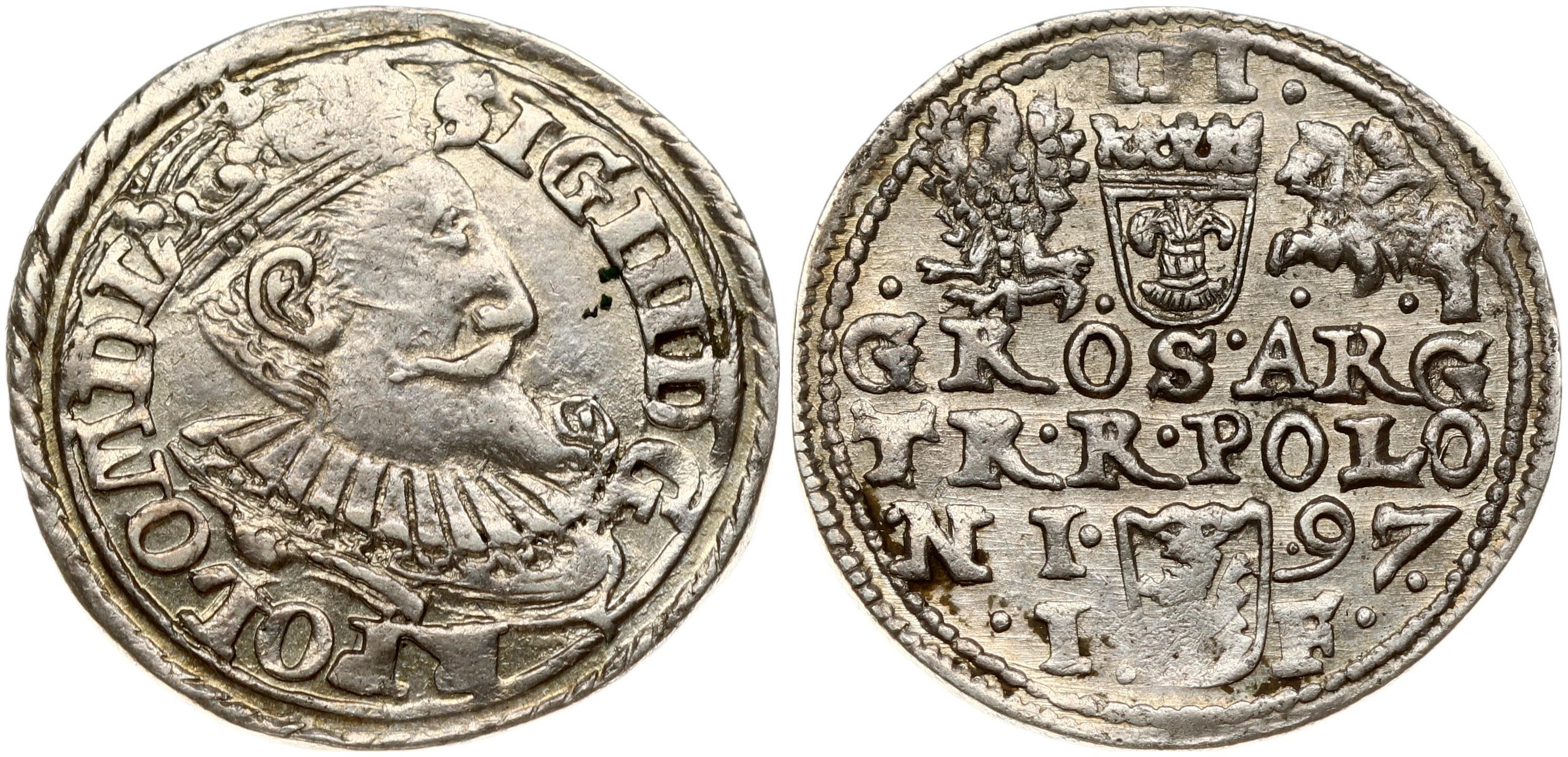 Poland 3 Groszy 1597 Olkusz Sigismund III Vasa (1587-1632). Obverse: Crowned bust right. Reverse: Value; divided date; symbols and two-line inscription between. Silver. Iger O.97.2.d