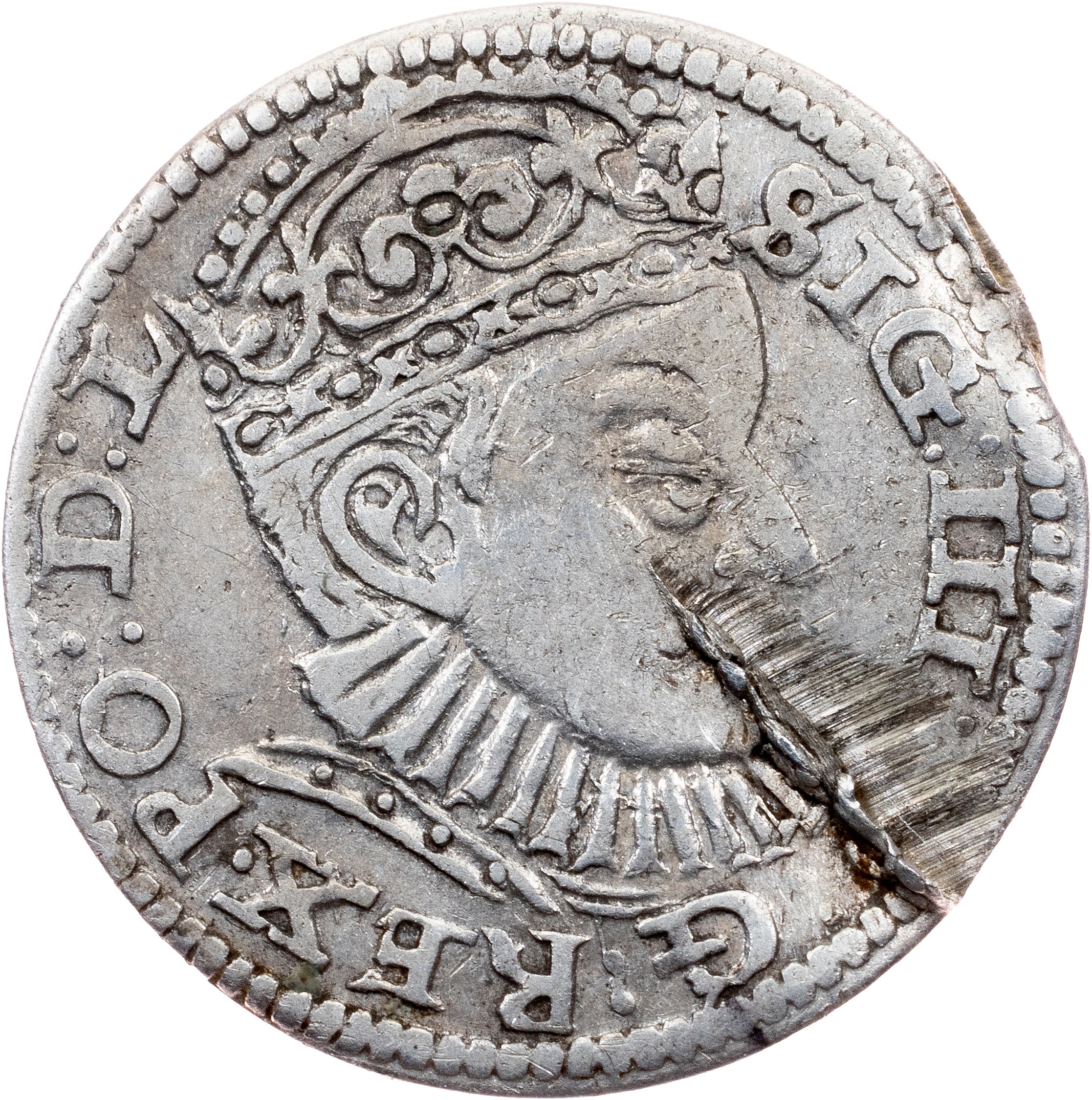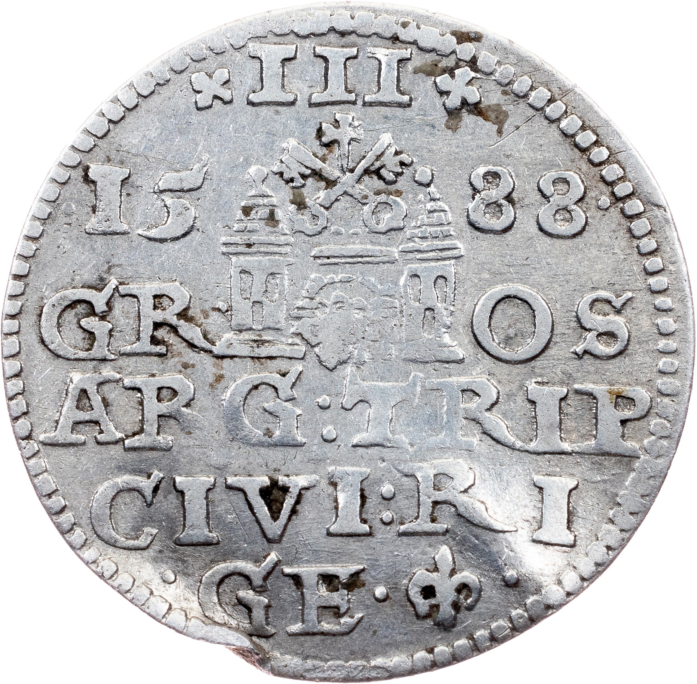 Duchy of Livonia, Sigismund III Vasa, 3 Groszy / Trojak 1588, Riga, 2,364 g, Silver, damaged; VF