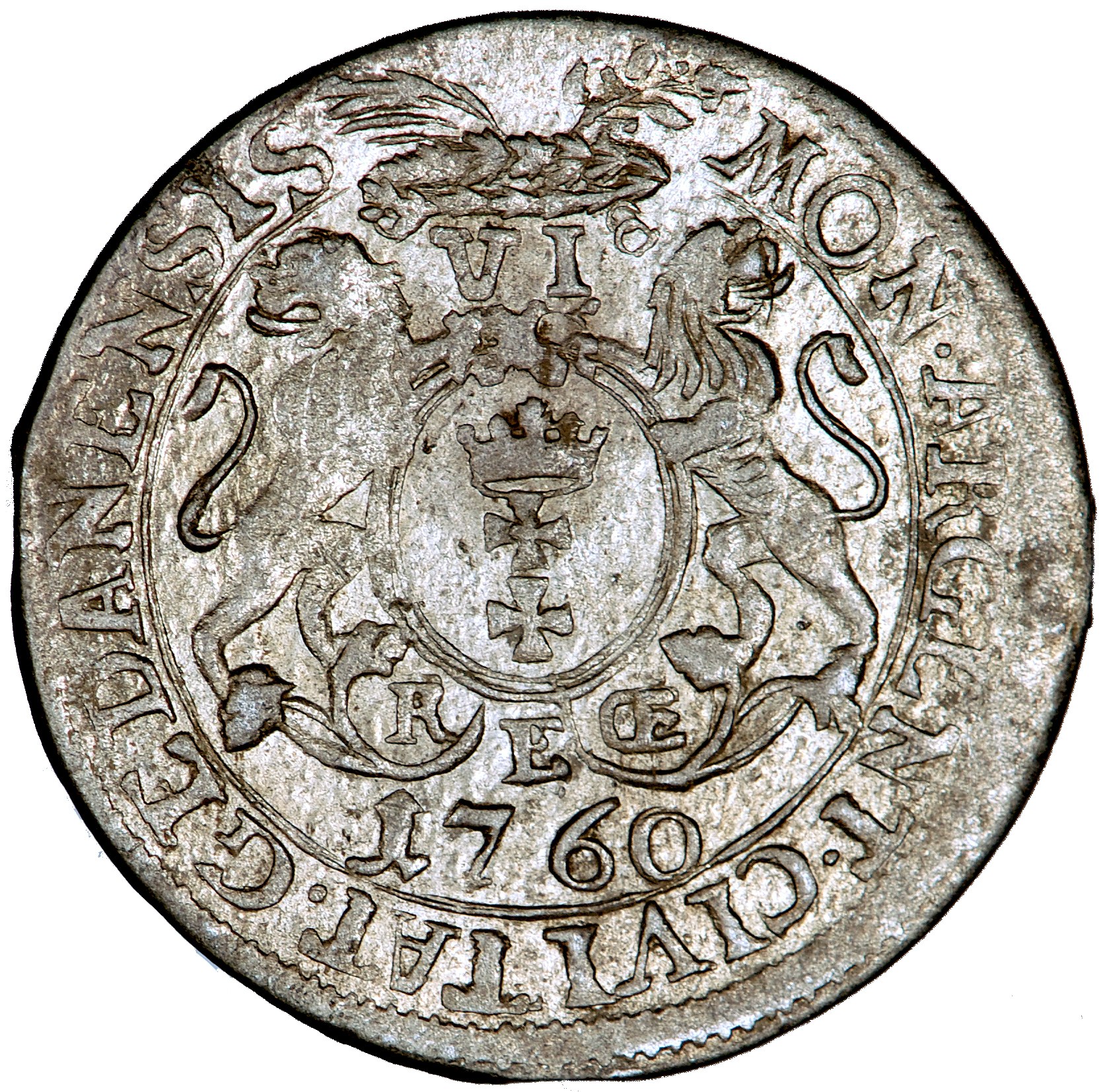 Polska, August III, Gdańsk, szóstak 1760, men. Gdańsk, R. Ernst Œckermann.