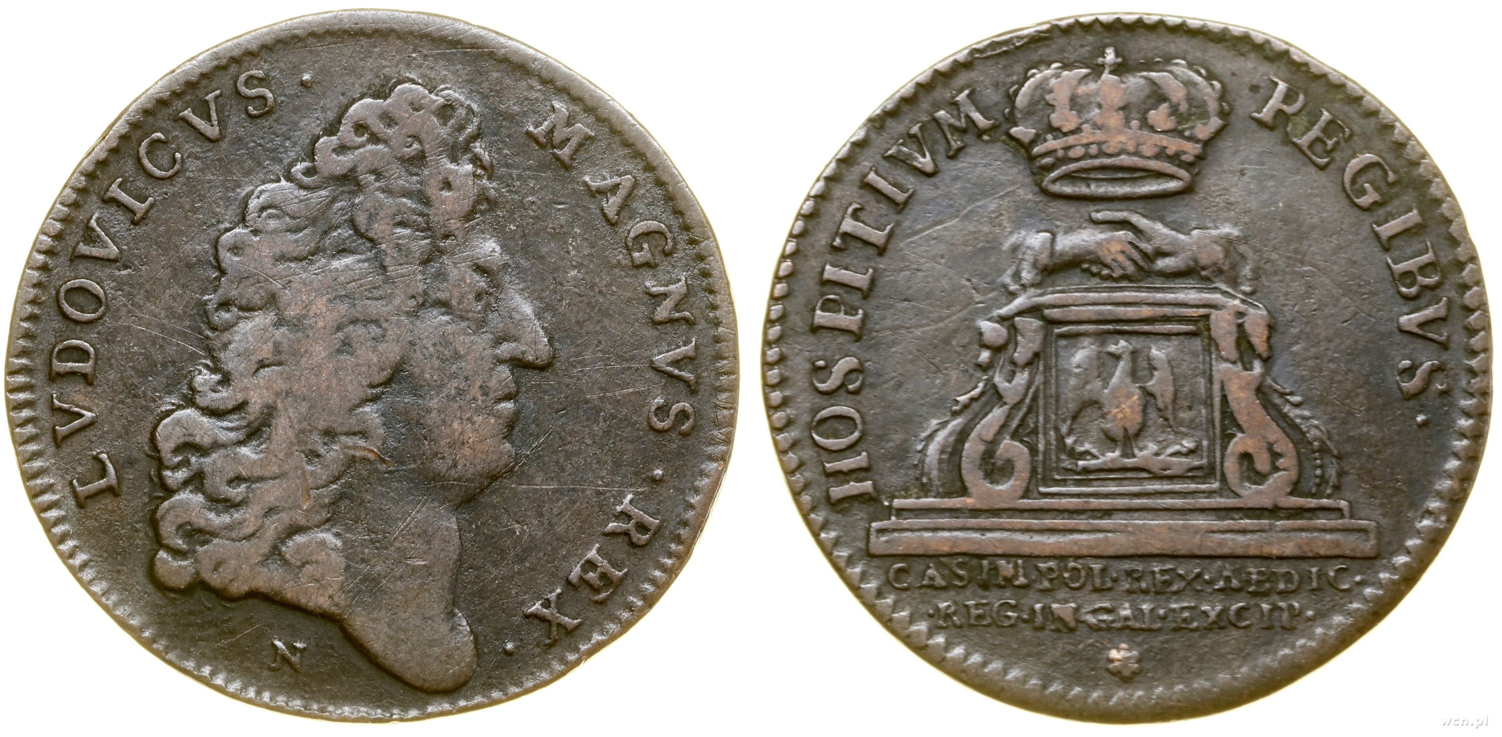 Aw: Głowa Ludwika XIV w prawo, LVDOVICVS MAGNVS REX, sygnatura N pod popiersiem; Rw: Korona, poniżej dłonie w uścisku na ołtarzu i napis CASIM POL REX ABDIC / REG IN GAL EXCIP, w półkolu powyżej HOSPITIVM REGIBVS