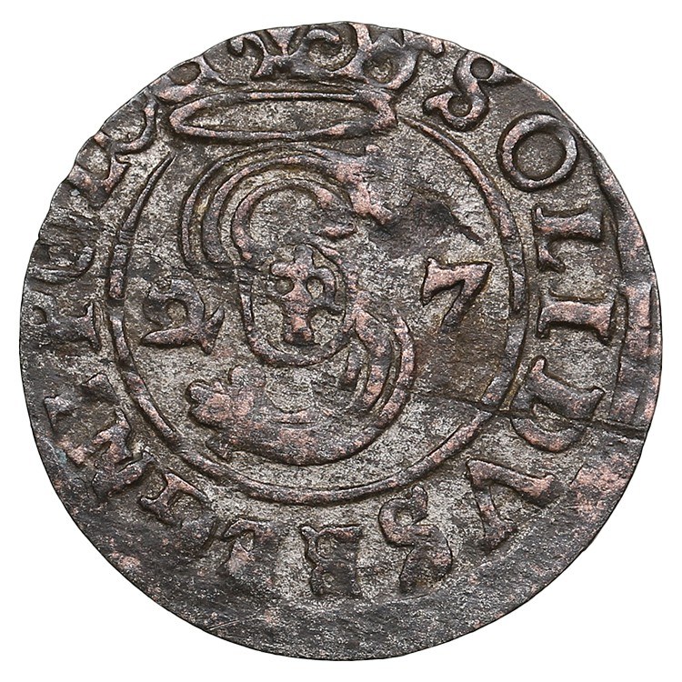 Rev.: Royal monogram: crowned S with Vasa arms divides date (16)2-7; “SOLIDVS REGNI POLO”.