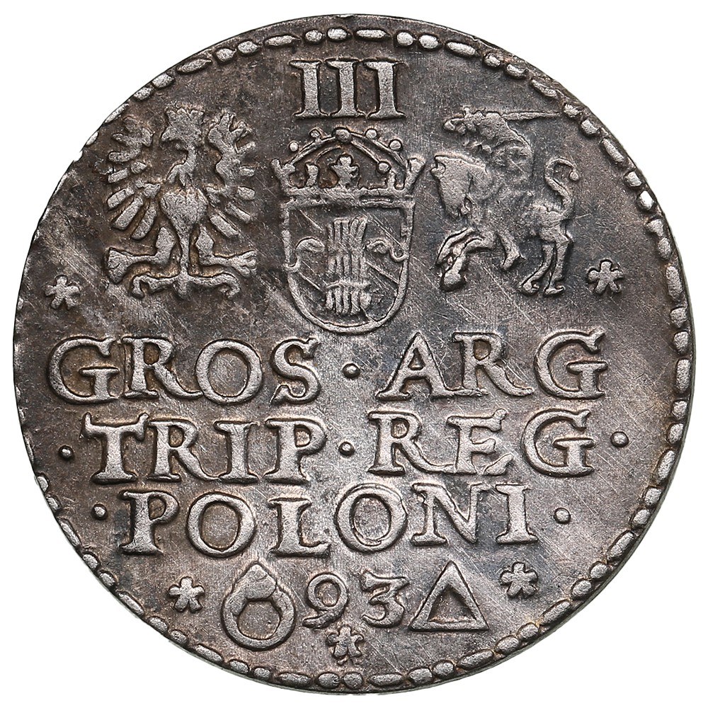 Rev.: Crowned Vasa arms between Polish and Lithuanian arms; above, III; legend in three lines “GROS·ARG·TRIP·REG·POLONI·”, below, 93 between ring and triangle.