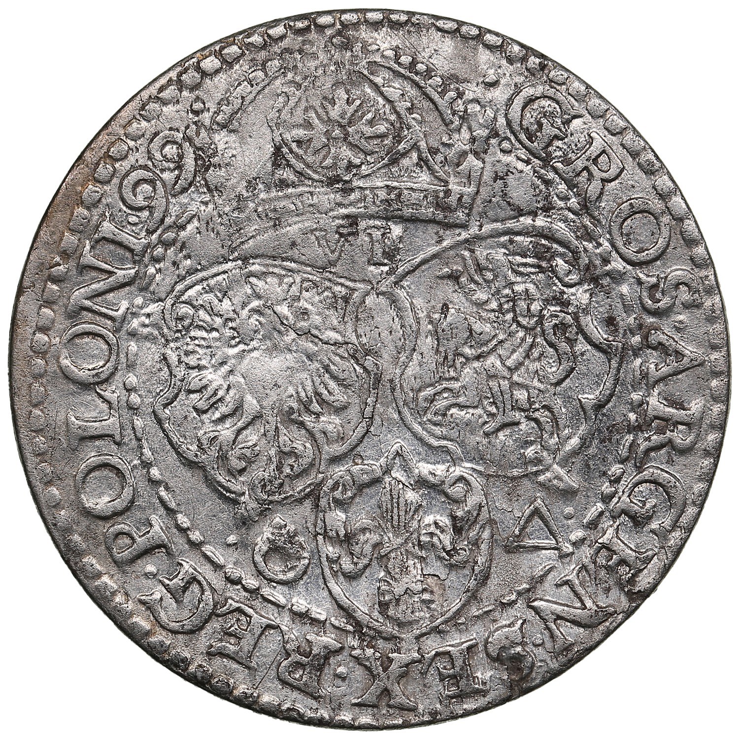 Rev: Three shields: of Poland, Lithuania, and Vasa arms between ring and triangle; above, VI and crown; “·GROS·ARGEN·SEX·REG·POLONI·99·”.