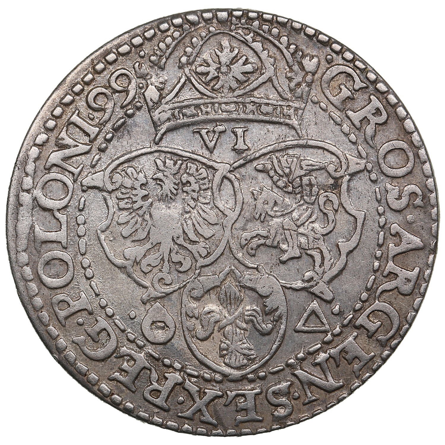 Rev: Three shields: of Poland, Lithuania, and Vasa arms between ring and triangle; above, VI and crown; “·GROS·ARGEN·SEX·REG·POLONI·99·”.