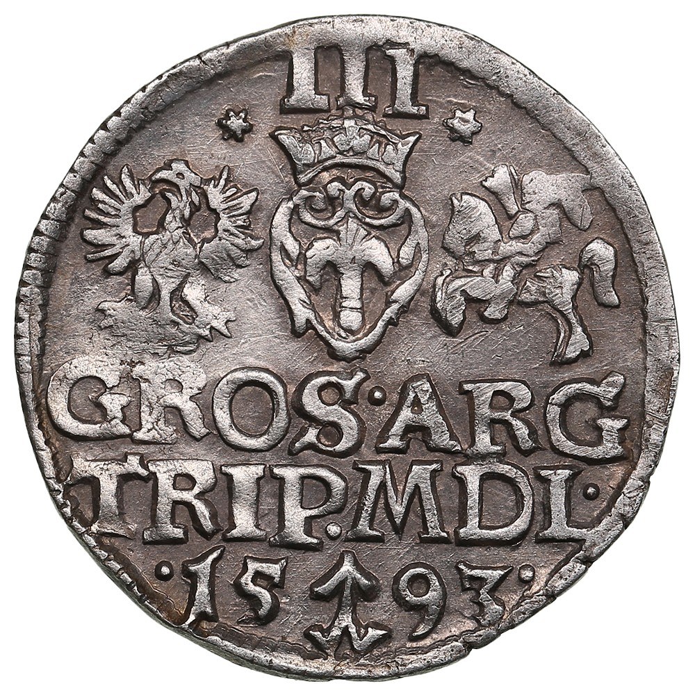 Rev.: Crowned Vasa arms between Polish and Lithuanian arms; above, *III*; legend in two lines “GROS·ARG TRIP·M D L·”, below, ·15-93· divided by arms of lithuanian treasurer Dimitri Chalecki.