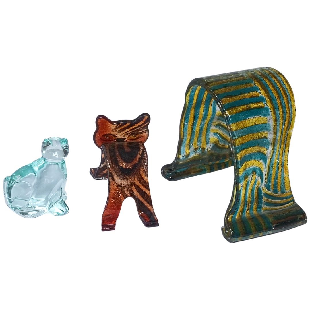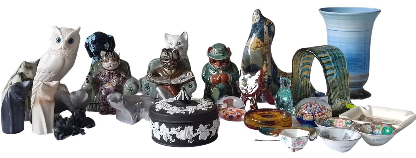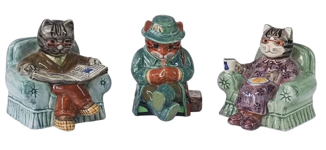 Trzy kolekcjonerskie figurki, przedstawiające koty ("George" - kot z gazetą, "Fisherman" - kot rybak, "Babcia" - kot z ciastem i kubeczkiem). Wyprodukowane przez angielską firmę Quail Ceramics, specjalizującą się w wytwarzaniu figurek i obiektów użytkowych w formie zwierząt domowych i z obejścia.