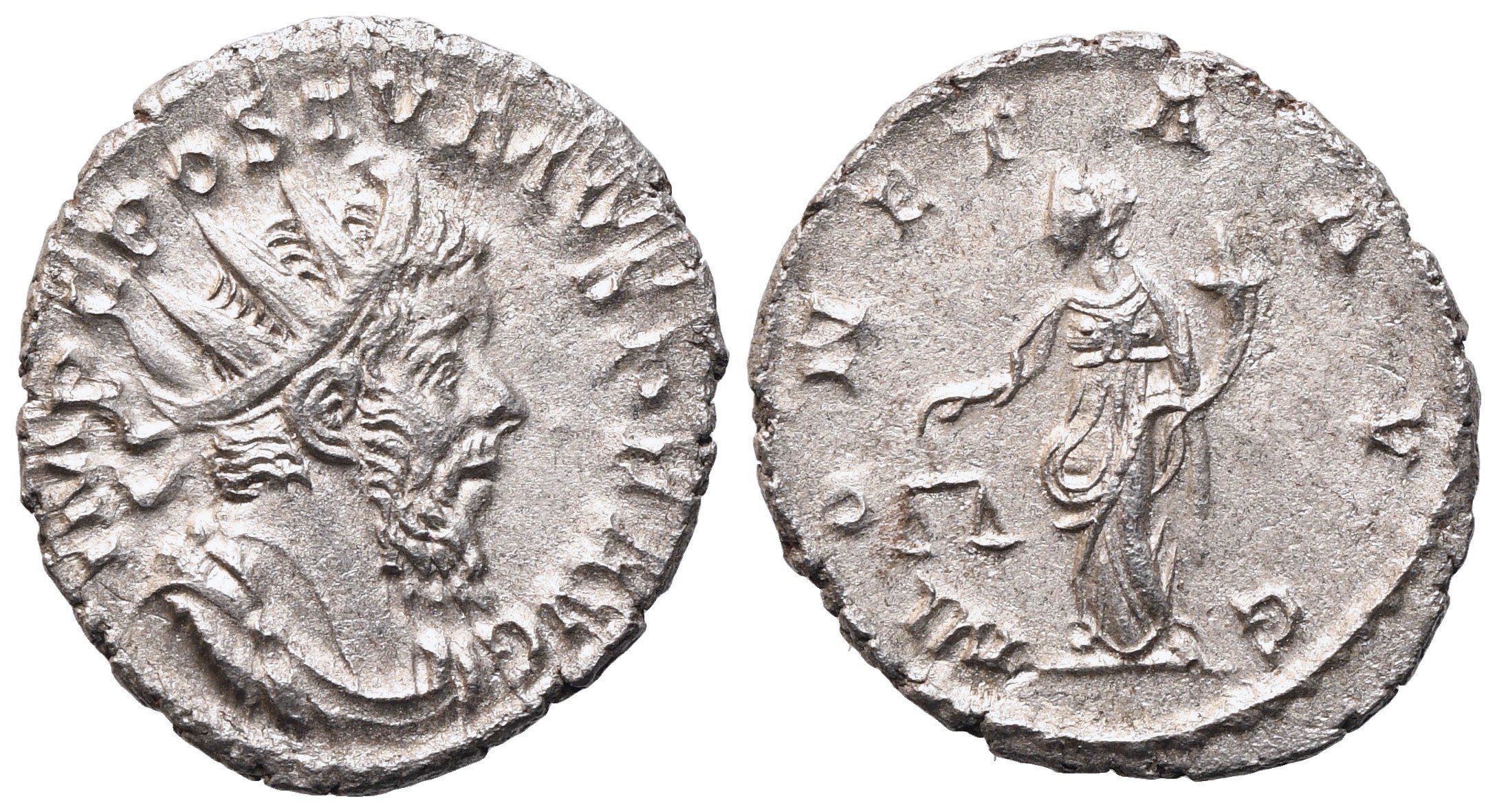 IMP C POSTVMVS P F AVG Radiate, draped and cuirassed bust of Postumus r.; Rv. MONETA AVG Moneta standing l., holding scales and cornucopia. RIC 75. About extremely fine.