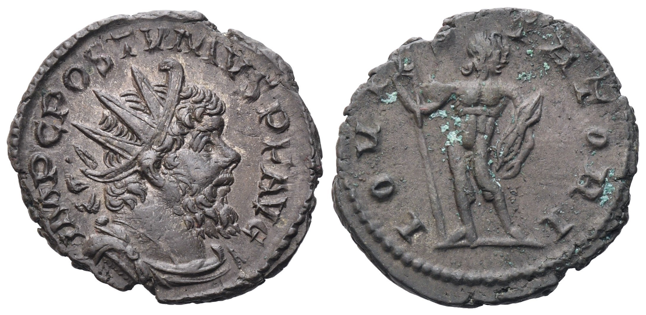 IMP C POSTVMVS P F AVG Radiate, draped and cuirassed bust r.; Rv. IOVI STATORI Jupiter standing r., holding sceptre and thunderbolt. RIC V 309 (Colonia Agrippinensis); Mairat 446; RSC 159a. aEF / gVF. Expressive portrait.