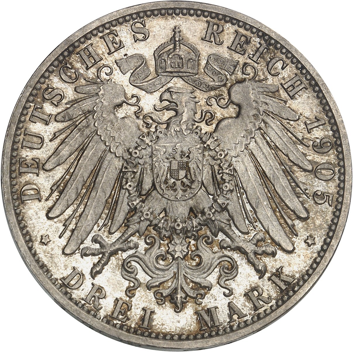 Rv. DEUTSCHES REICH (date) / * DREI MARK *. Aigle éployée et couronnée, avec écu en cœur.