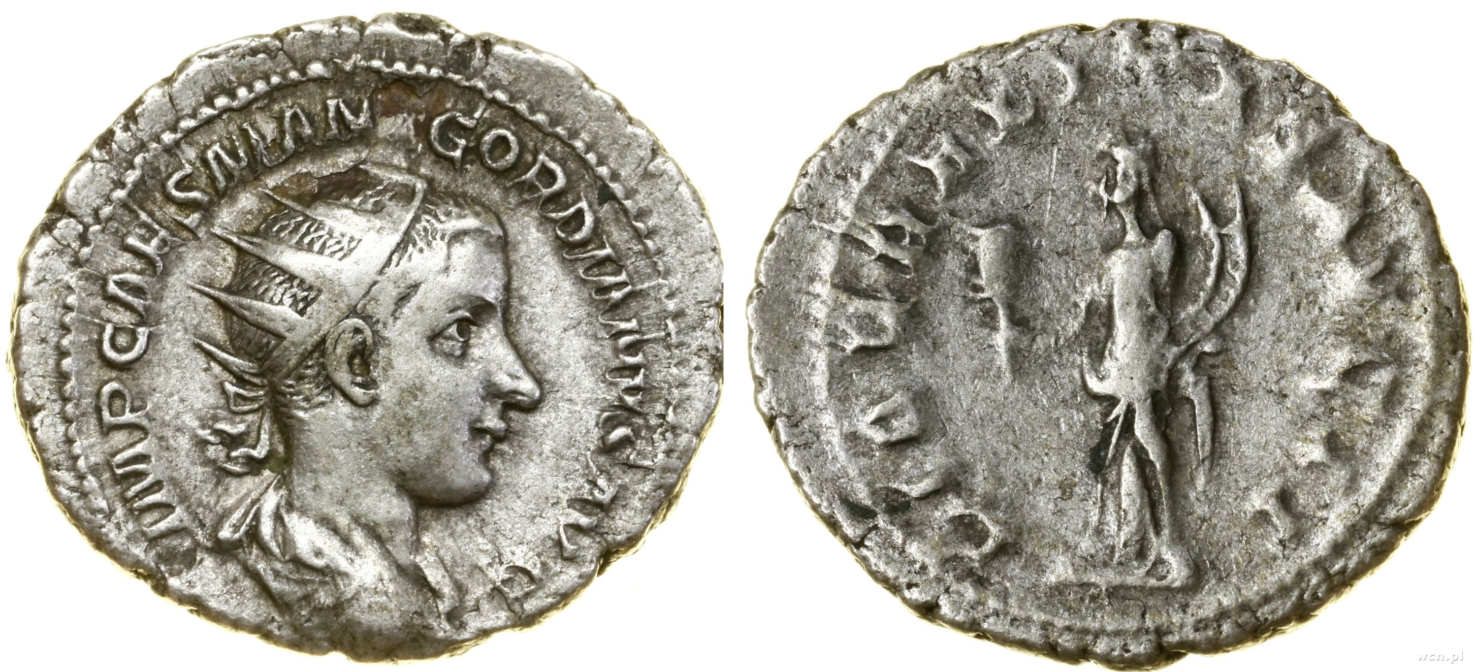 Aw: Popiersie cesarza w koronie radialnej w prawo, IMP CAES M ANTO GORDIANVS AVG, Rw: Liberalitas stojąca w lewo, trzymająca abakus i róg obfitości, LIBERALITAS AVG