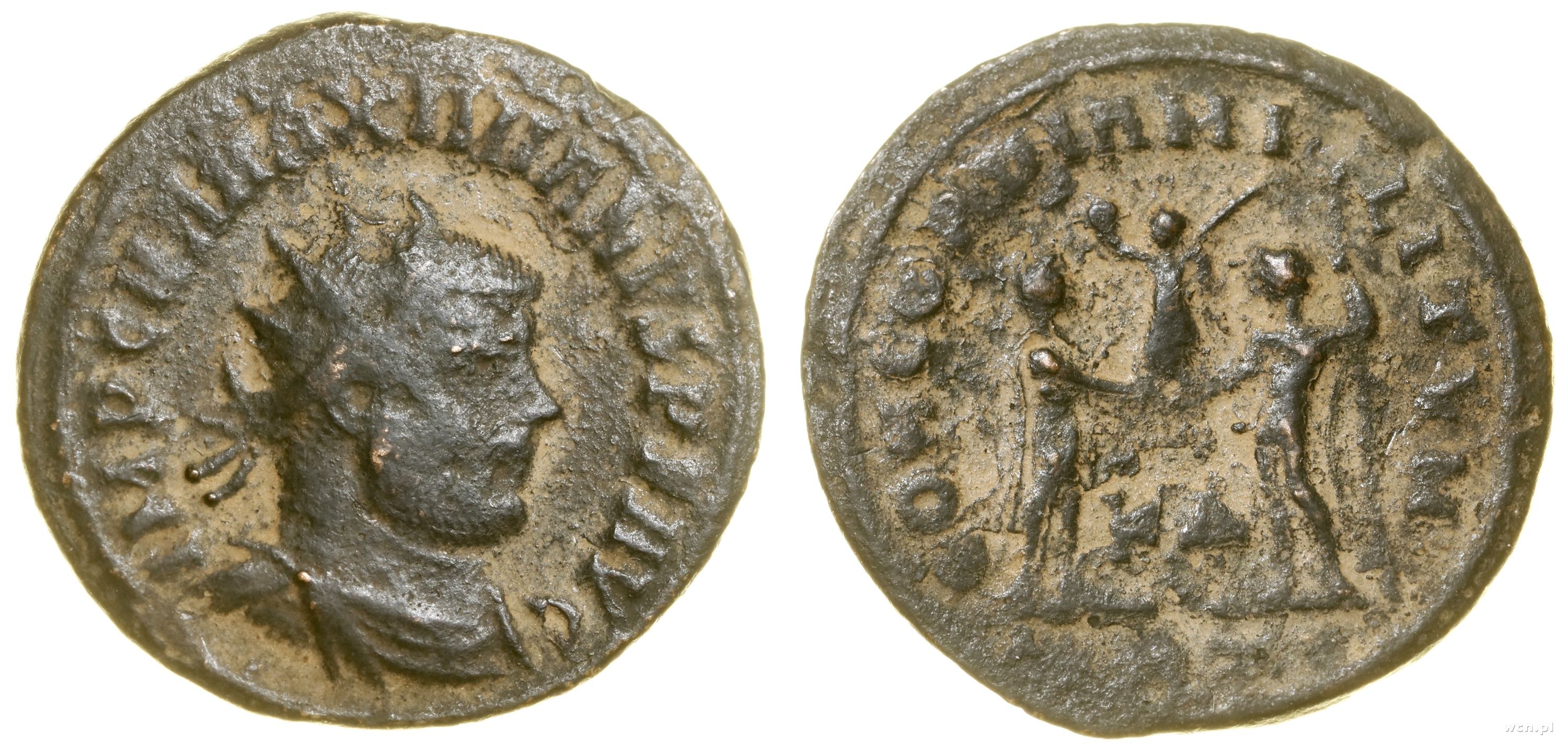 Aw: Popiersie cesarza w koronie radialnej w prawo, IMP C M A MAXIMIANVS P F AVG; Rw: Maksymian w zbroi stojący w prawo otrzymuje od Jupitera trzymającego berło, stojącego w lewo, Wiktorię na globie, CONCORDIA MILITVM, w polu K∆, w odcinku nieczytelne litery