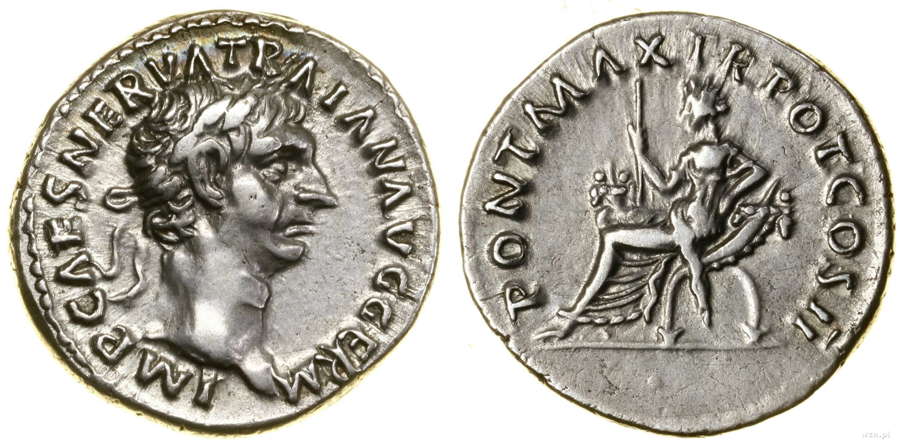 Aw: Głowa cesarza w wieńcu laurowym w prawo, IMP CAES NERVA TRAIAN AVG GERM, Rw: Abundantia siedząca w lewo, trzymająca berło, róg obfitości oparty o krzesło, PONT MAX TR POT COS II