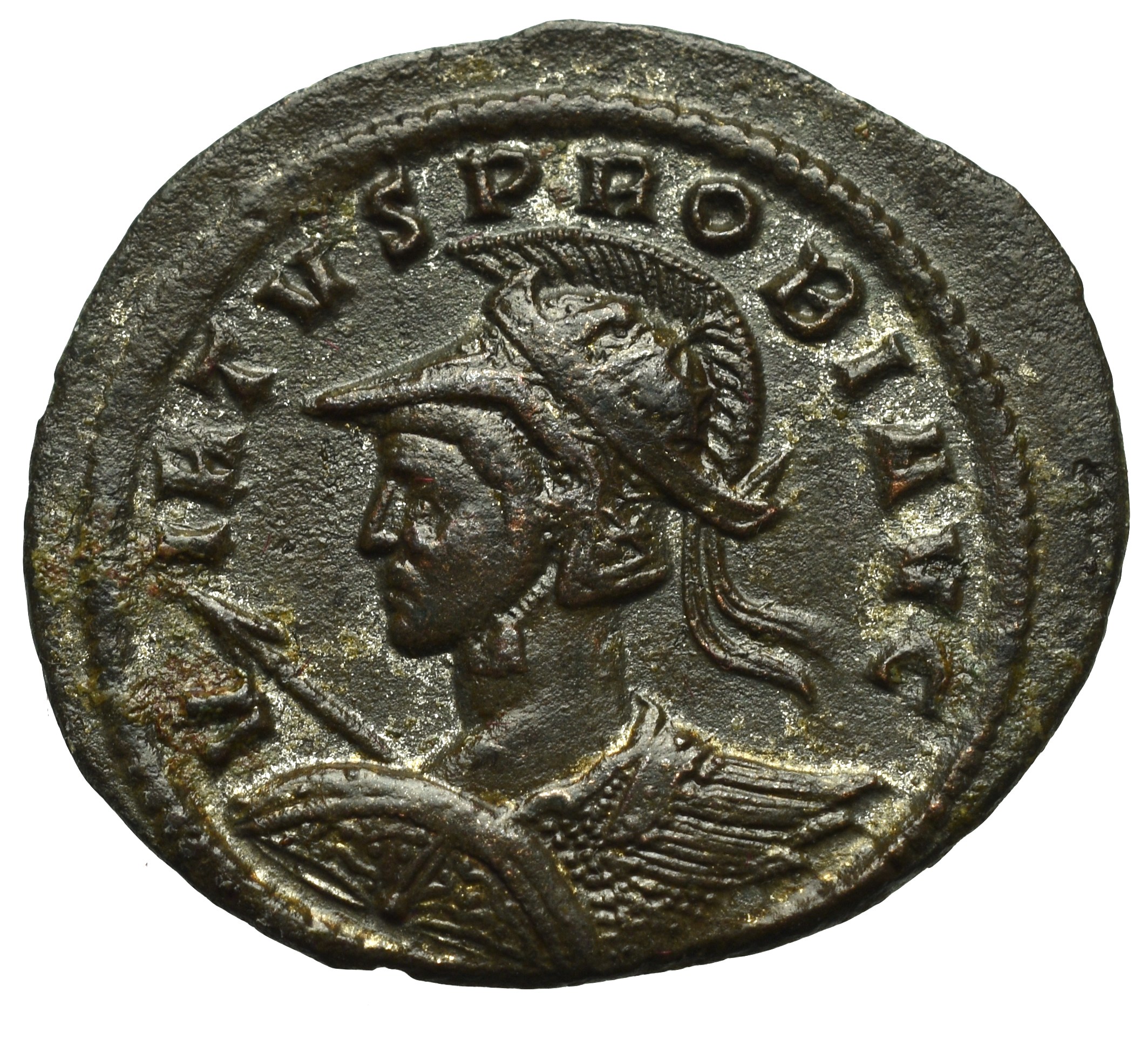 BUST TYPE: E2 = Radiate, cuirassed, helmeted bust left, holding spear and shield, seen from rear