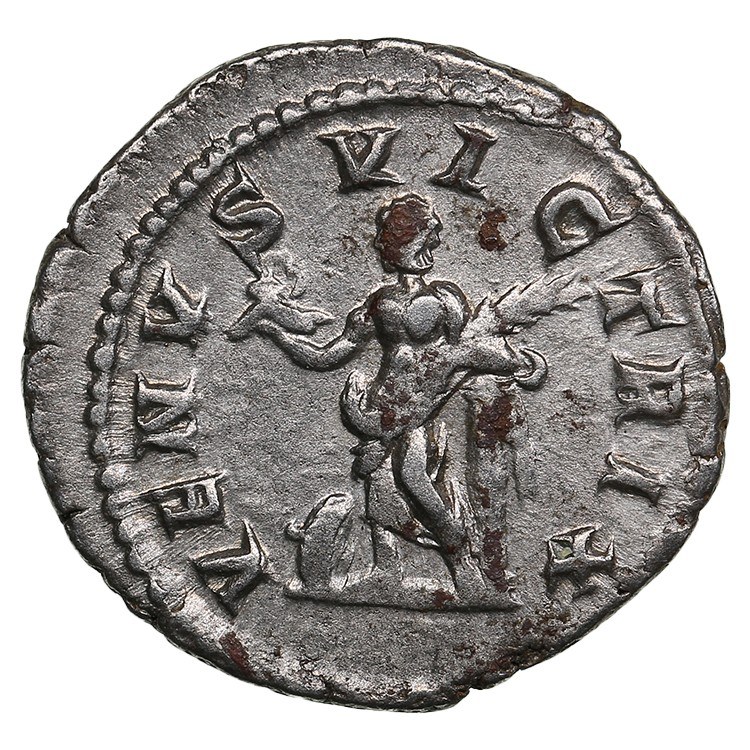 Rev: Venus standing facing, leaning on column, head left; holding helmet and palm branch; shield at feet to left; “VENVS VICTRIX”.