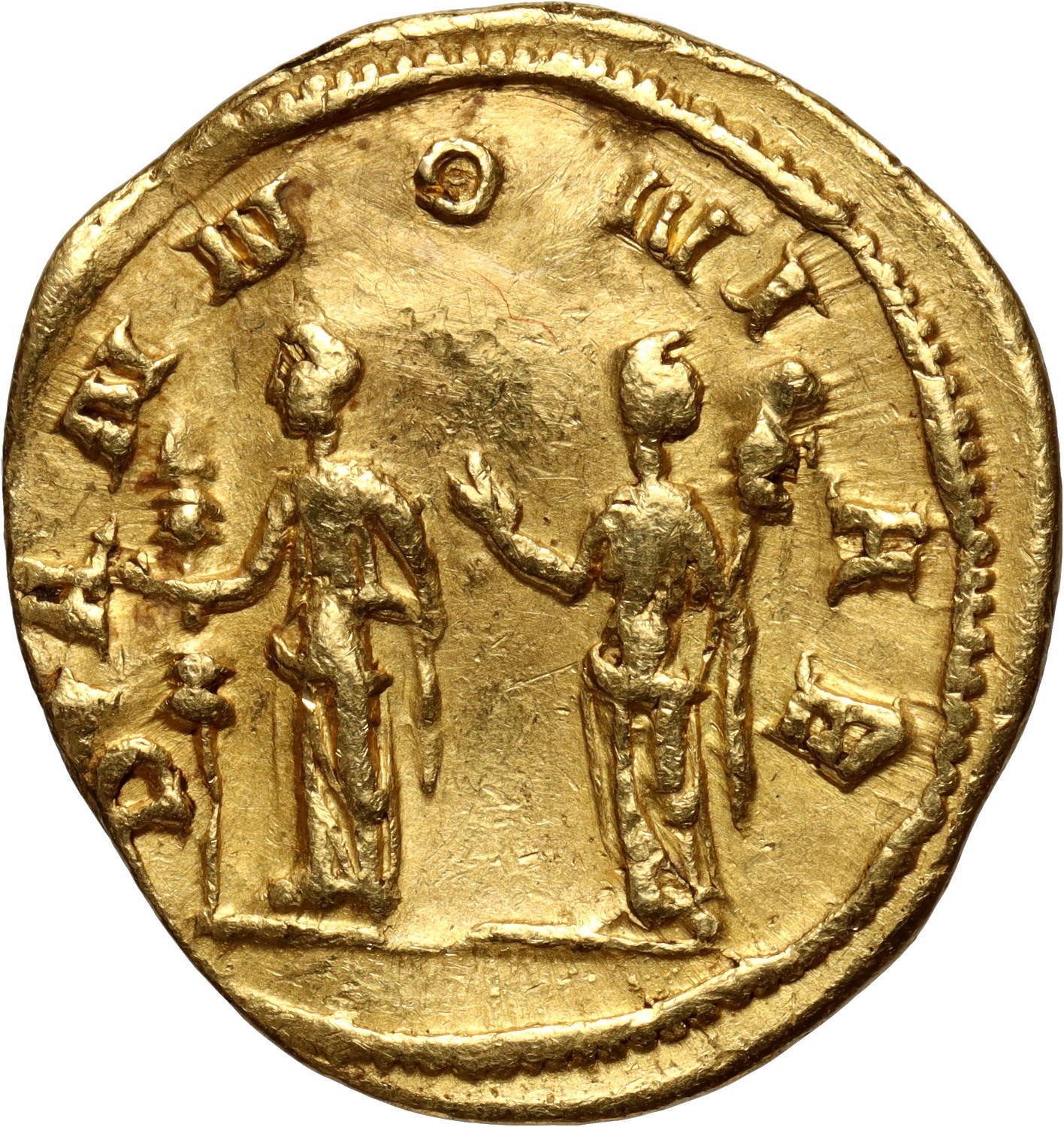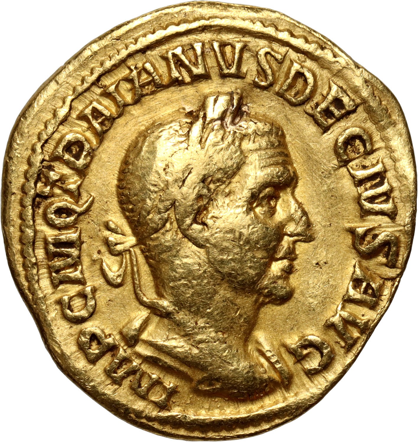 Gold 4,37 g, 19 mm. Obverse: bust of Trajan Decius with a laurel wreath facing right, around the legend IMP C M Q TRAIANVS DECIVS AVG. Reverse: two Pannonias standing frontally with their heads turned to the left and right, holding standards, around the legend PANNONIAE.