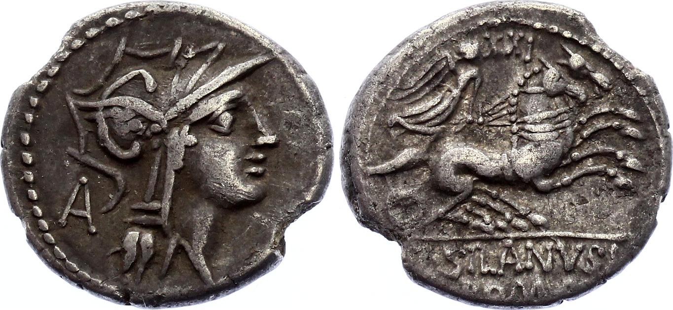 Obv. Helmeted head of Roma right ,A behind . Rev. Victory in biga right, VIII above, D SILANVS L F ROMA in ex. Sear 225 | Crawford 337-3 | Sydenham 646 | Albert 1161