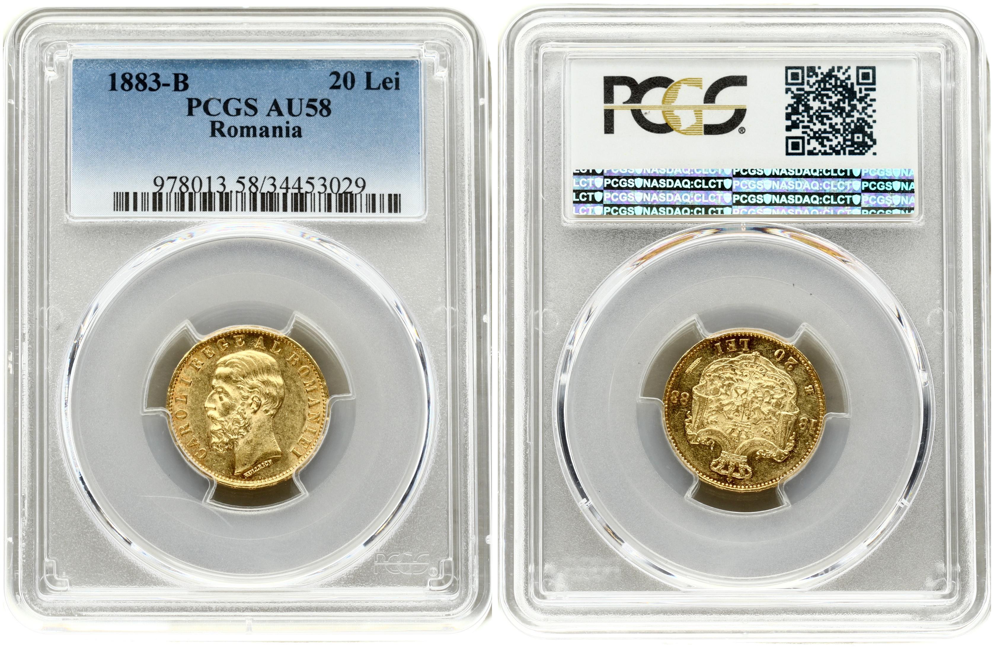 Romania 20 Lei 1883B Carol I(1866-1914). Obverse: Head left. Obverse Legend: CAROL I REGE (King). Reverse: Crowned arms with supporters within crowned mantle; divided date. Gold 6.45g. KM 20. PCGS AU58