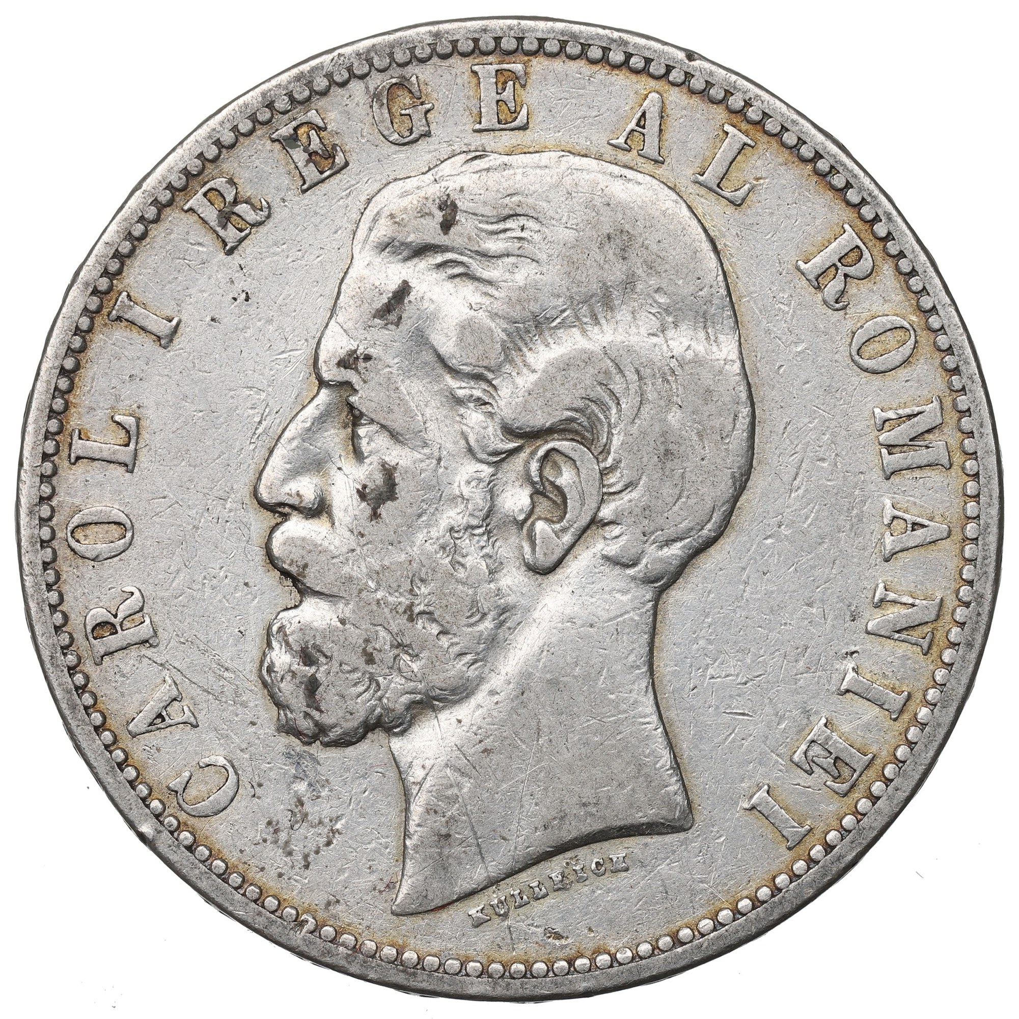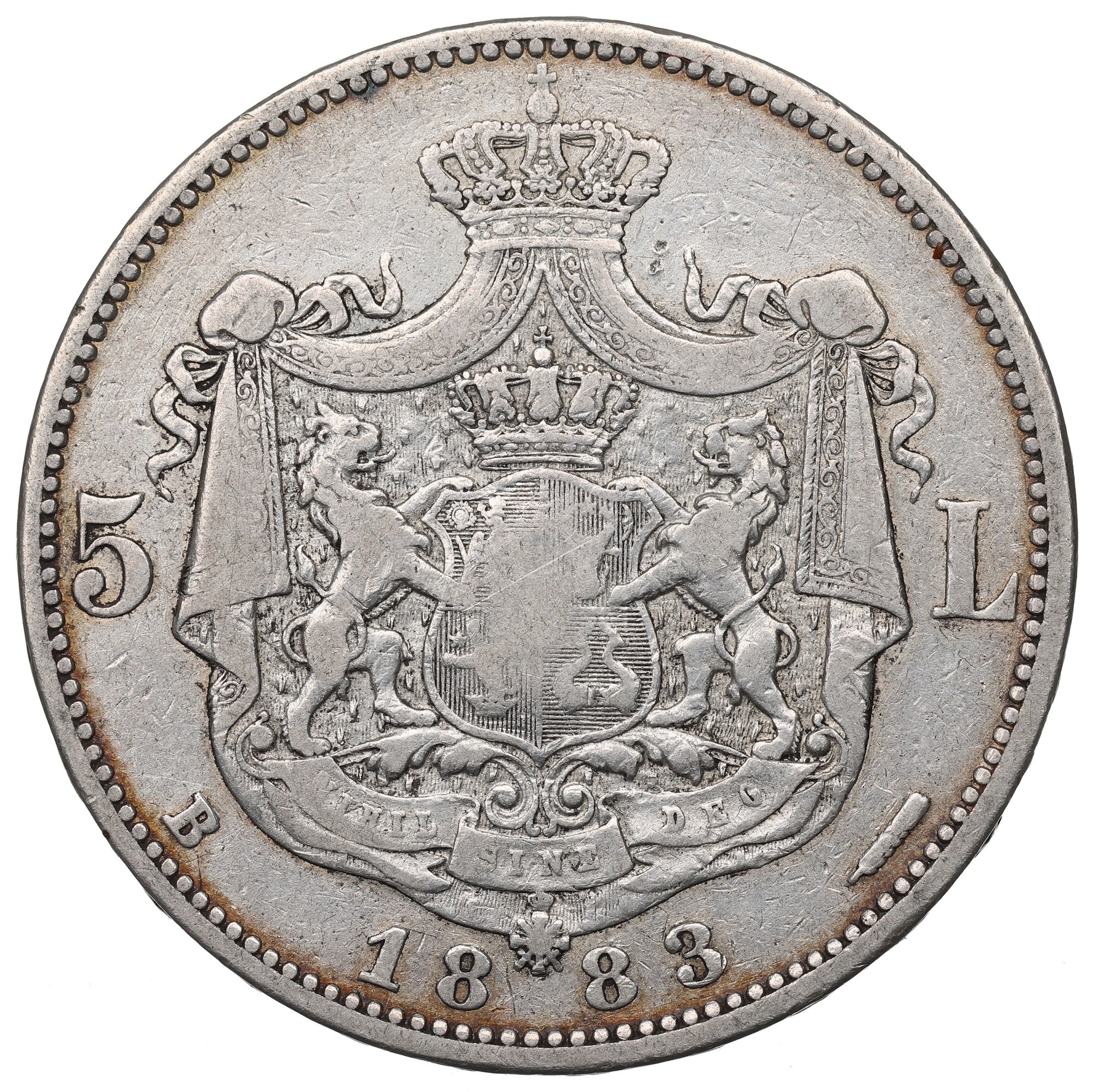 Rewers: ozdobny kartusz z herbem Rumunii, po jego bokach oznaczenie nominału 5-L, poniżej B-1883-Kłos;