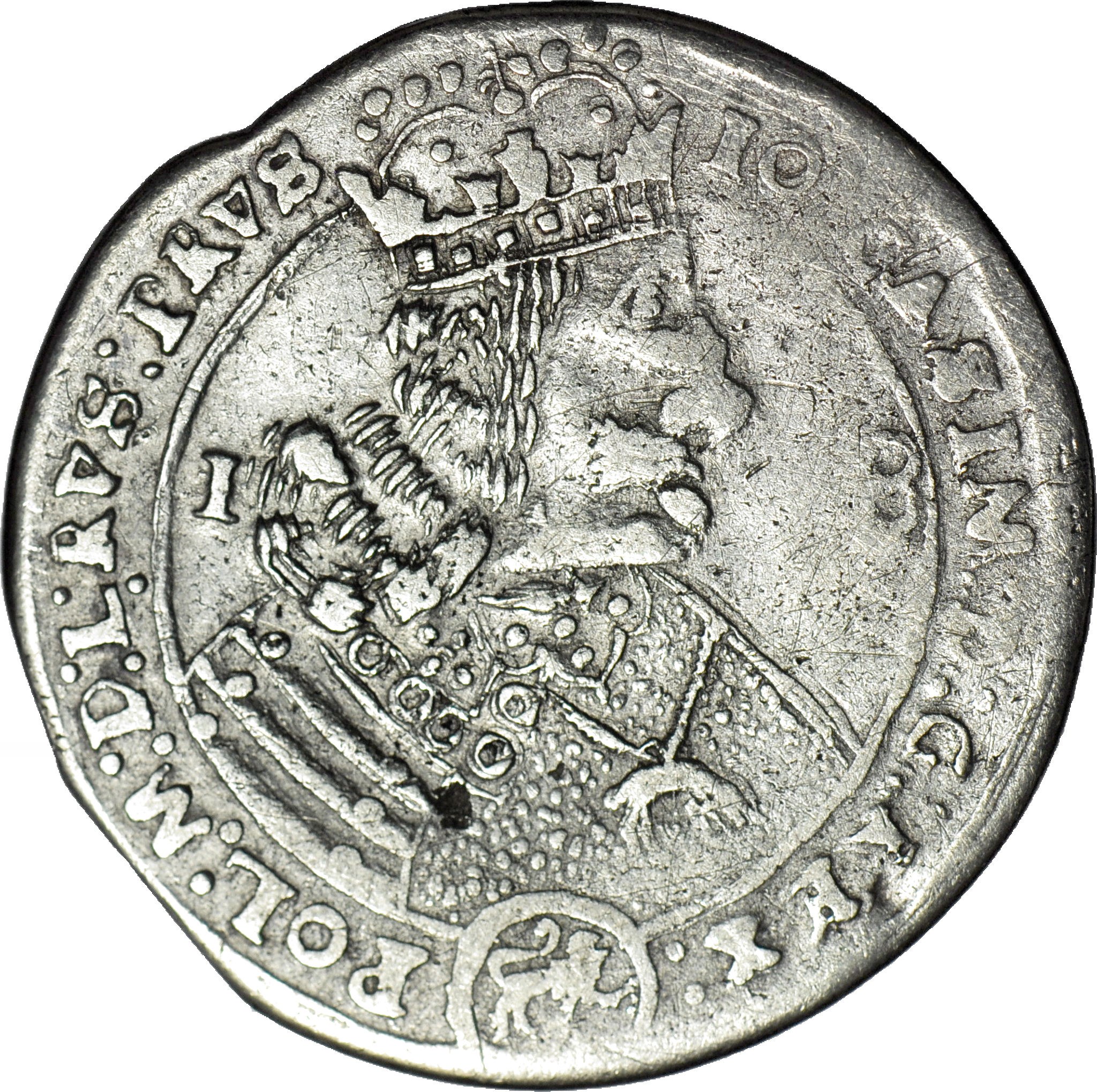 Wojenna moneta bita podczas potopu szwedzkiego w pośpiesznie utworzonej mennicy we Lwowie z blachy zrobionej m.in. ze stopionych sreber kościelnych, stąd praktycznie wszystkie posiadają niedobicia, pęknięcia blachy, czy inne niedoskonałości. Głęboko odbity egzemplarz o bardzo dobrej prezencji.