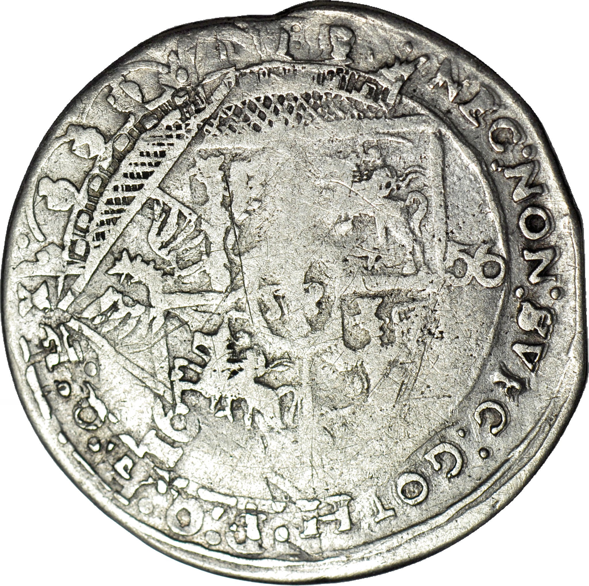 Ort wybity w końcowym etapie emisji, z małymi literami typowymi dla bić z końca 1656 i 1657 roku, gdy stemple użyte do bicia tej monety rytował Dąbrowski po 10 sierpnia 1656.