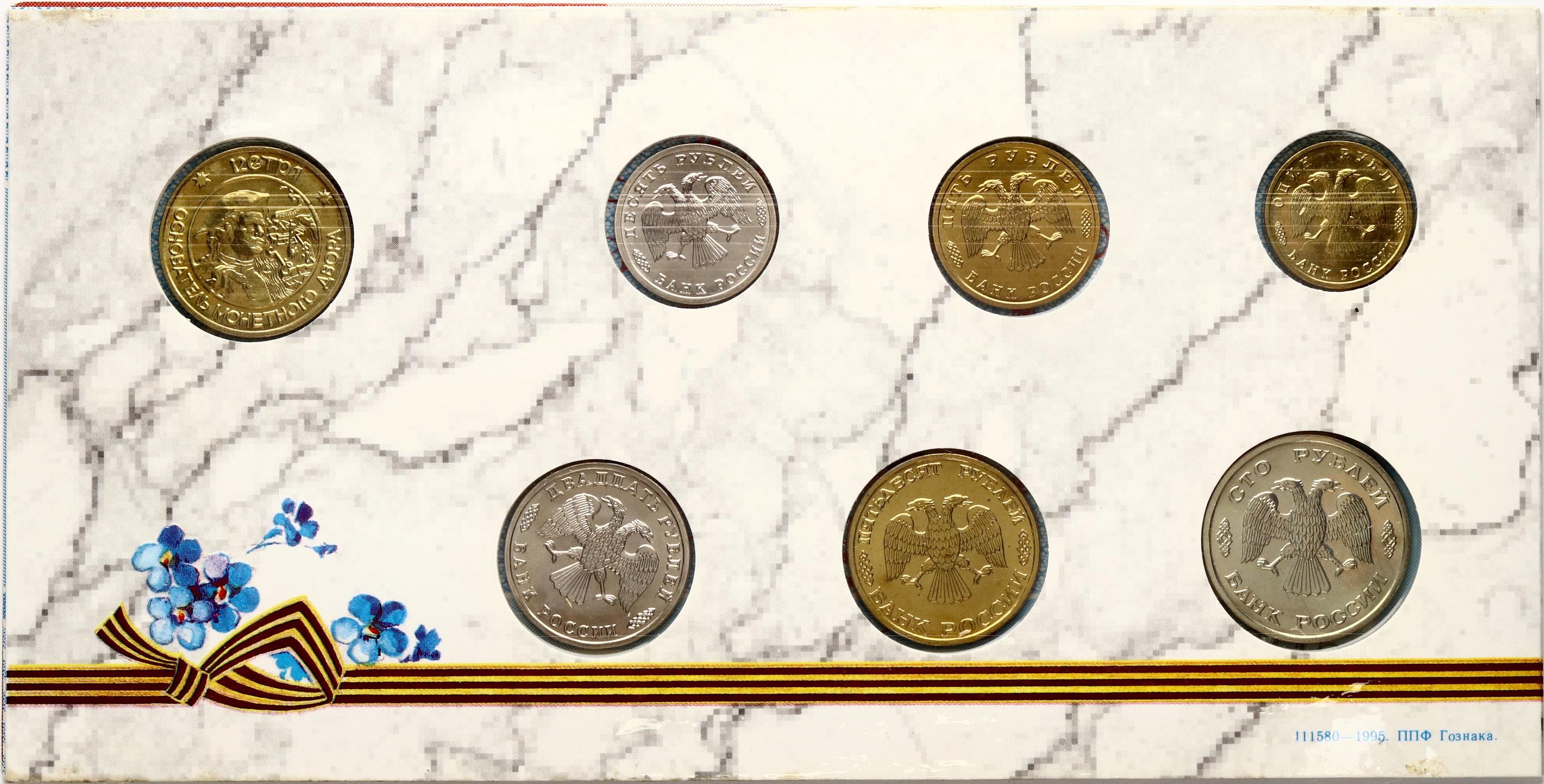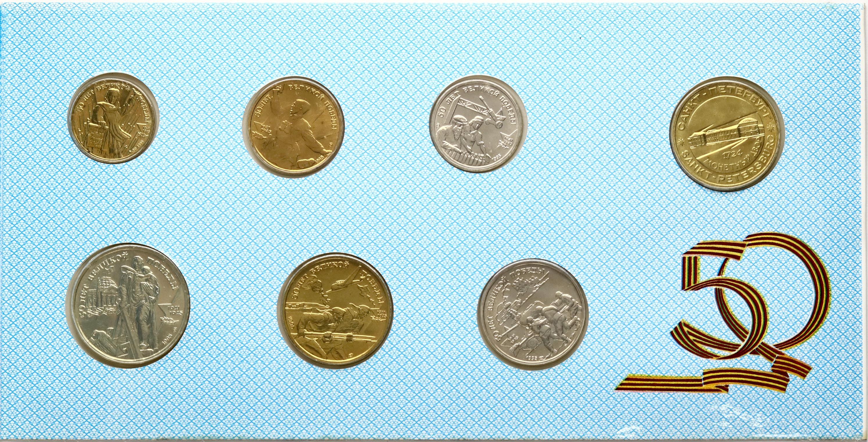 Russia. 1 - 100 Roubles 1995 СПБ, Saint Petersburg, Set. The 50th Anniversary of Victory in the Great Patriotic War of 1941-1945. Brass, copper-nickel. In bank pack & paper envelope. Lot of 6 coins & 1 token.