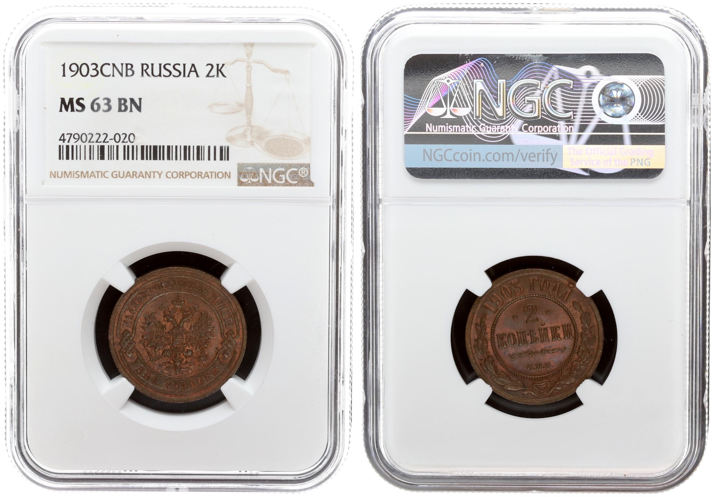 Russia 2 Kopecks 1903 СПБ St. Petersburg. Nicholas II (1894-1917). Averse:Crowned double-headed imperial eagle within circle. Reverse: Value flanked by stars within beaded circle.Copper. Edge ribbed. Bitkin 233. NGC MS 63 BN