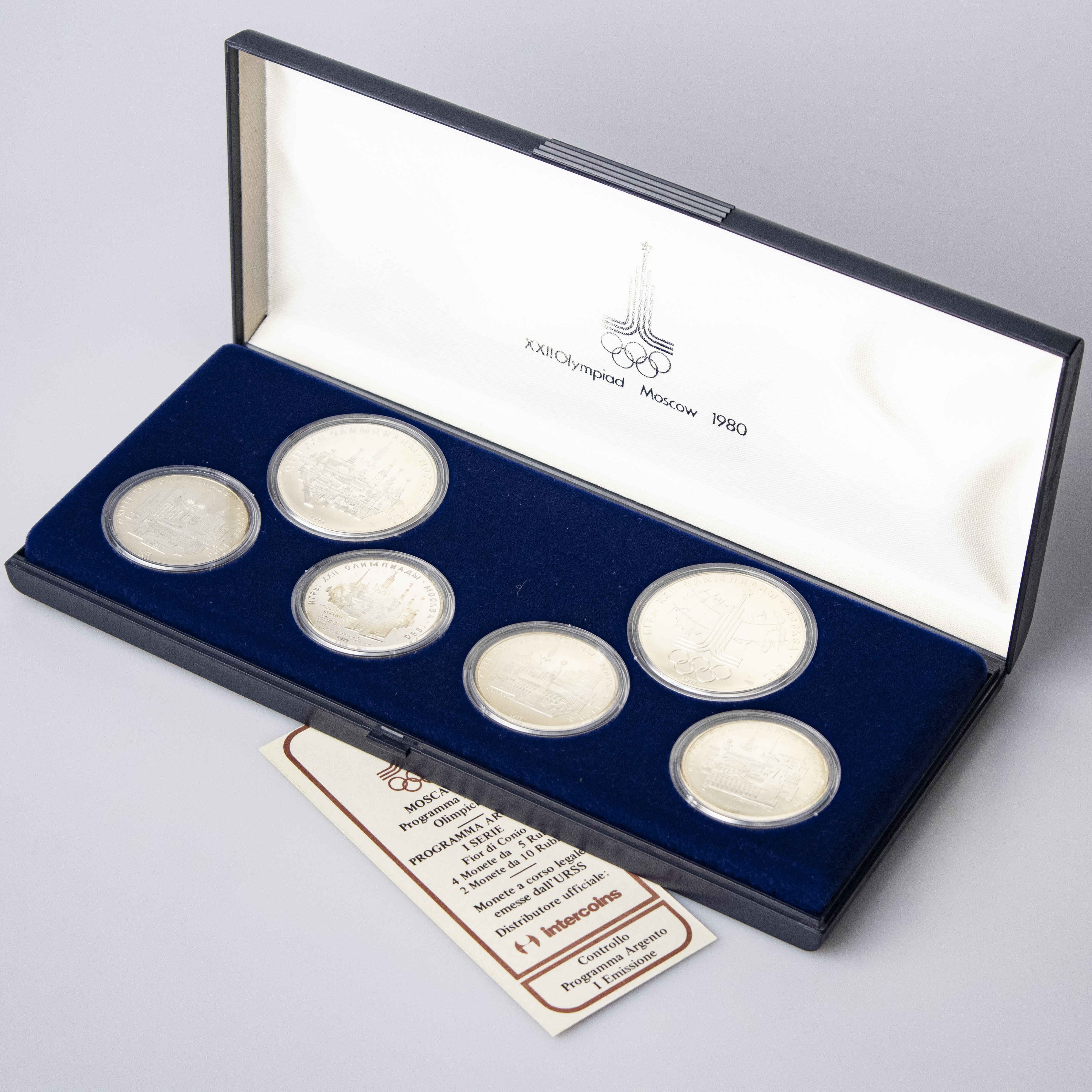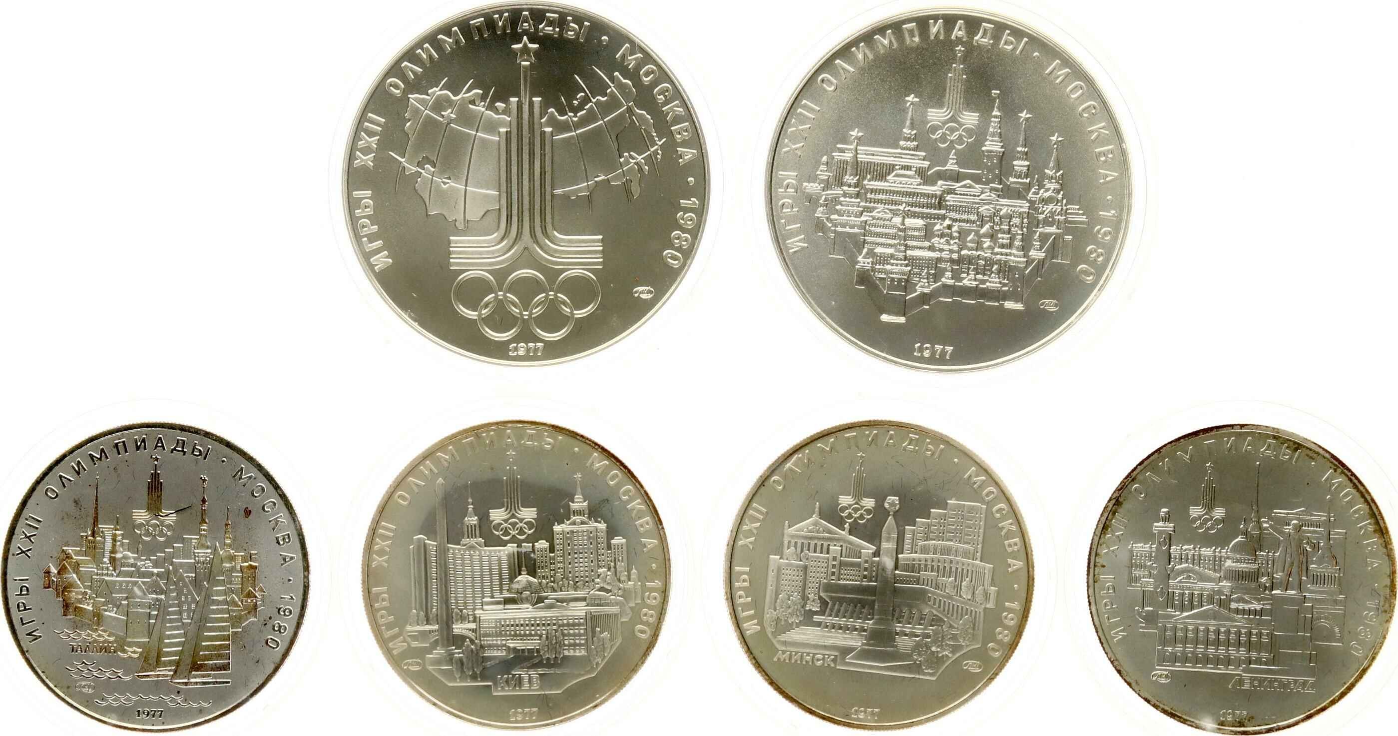 Russia 5 & 10 Roubles 1977 1980 Olympics SET. Commemorative issue. Obverse: National arms divide CCCP with value below. Reverse: Scenes 1980 Olympics. Silver. With Original Box. Lot of 6 Coins