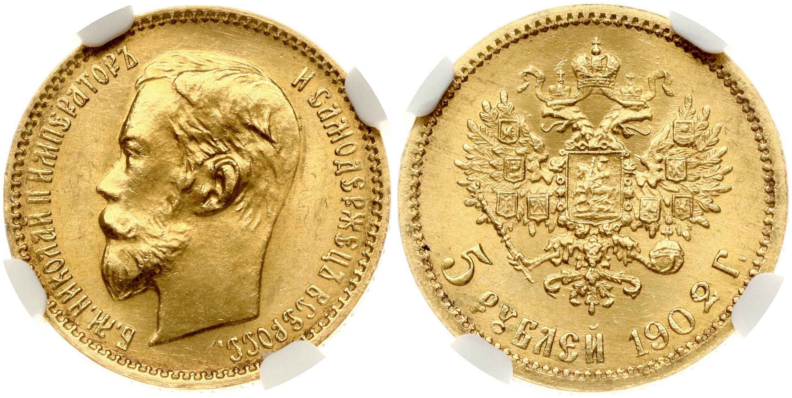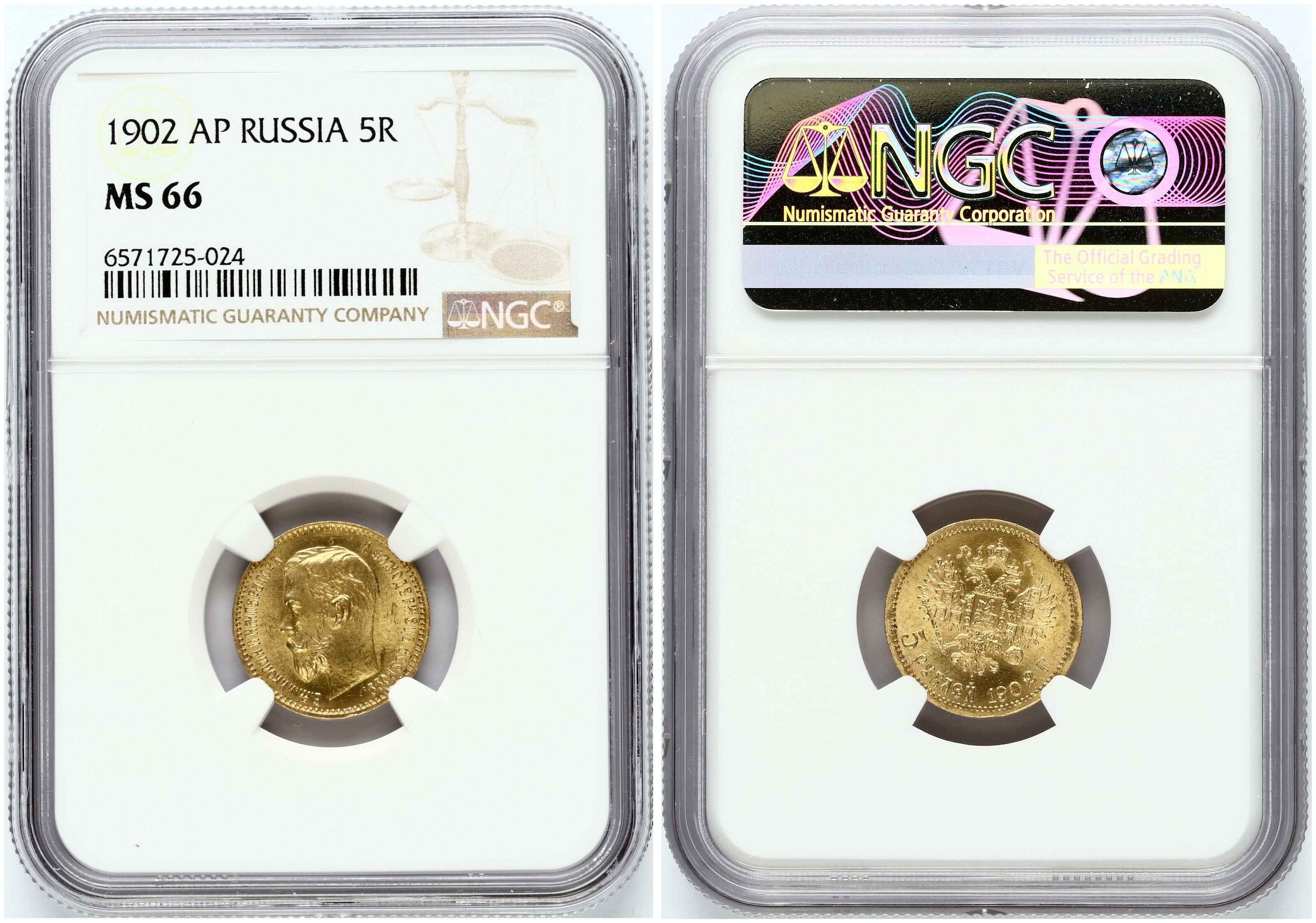 Russia 5 Roubles 1902 (AP) St. Petersburg. Nicholas II (1894-1917). Obverse: Head right. Reverse: Crowned double imperial eagle ribbons on crown. Gold 4.30g. Edge patterned. Bitkin 29. NGC MS 66