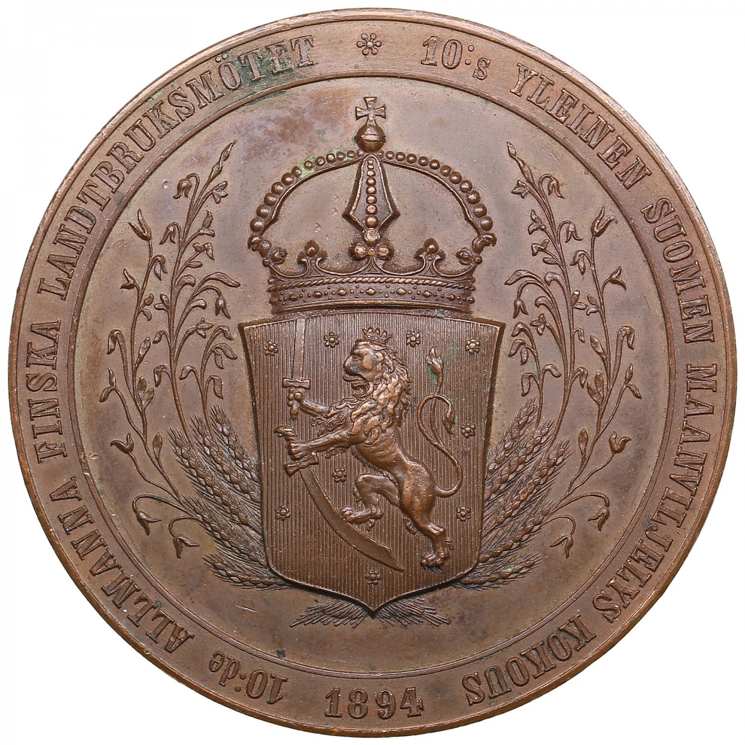 Rev.: Coat of arms of the Grand Duchy of Finland - crowned lion within a shield, flanked by branches of grain and laurel. Inscription around: 10:S ALLMÄNNA FINSKA LANDTBRUKSMÖTET – 10:S YLEINEN SUOMEN MAATALOUSKOKOUS - 1894 (10th General Finnish Agricultural Meeting 1894).