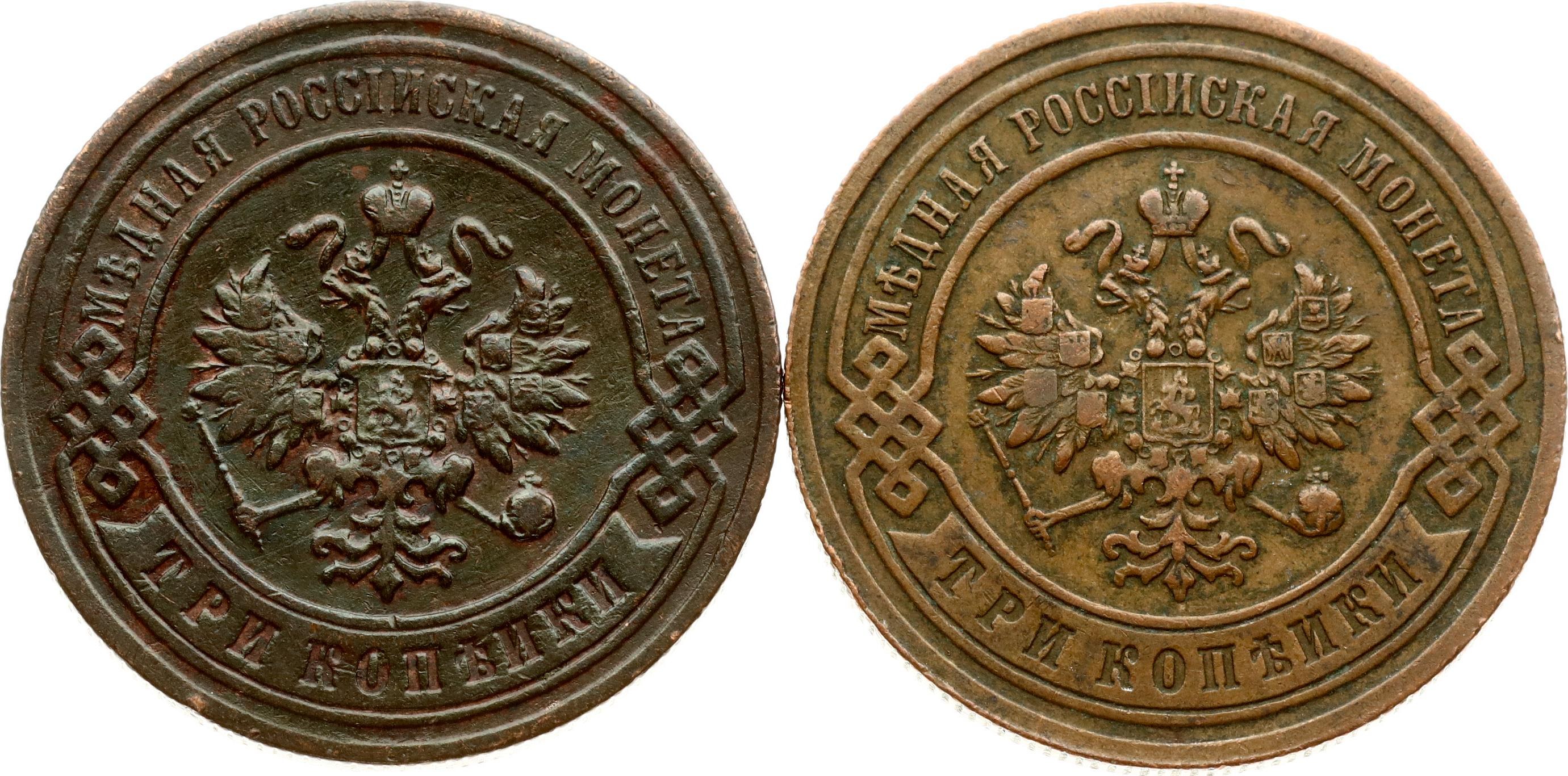 Russia. Nicholas II (1894-1917). 3 Kopecks 1895 СПБ & 1898 СПБ, St. Petersburg. Copper, total weight, 19.50 g. Y 214, 285. Lot of 2 coins.