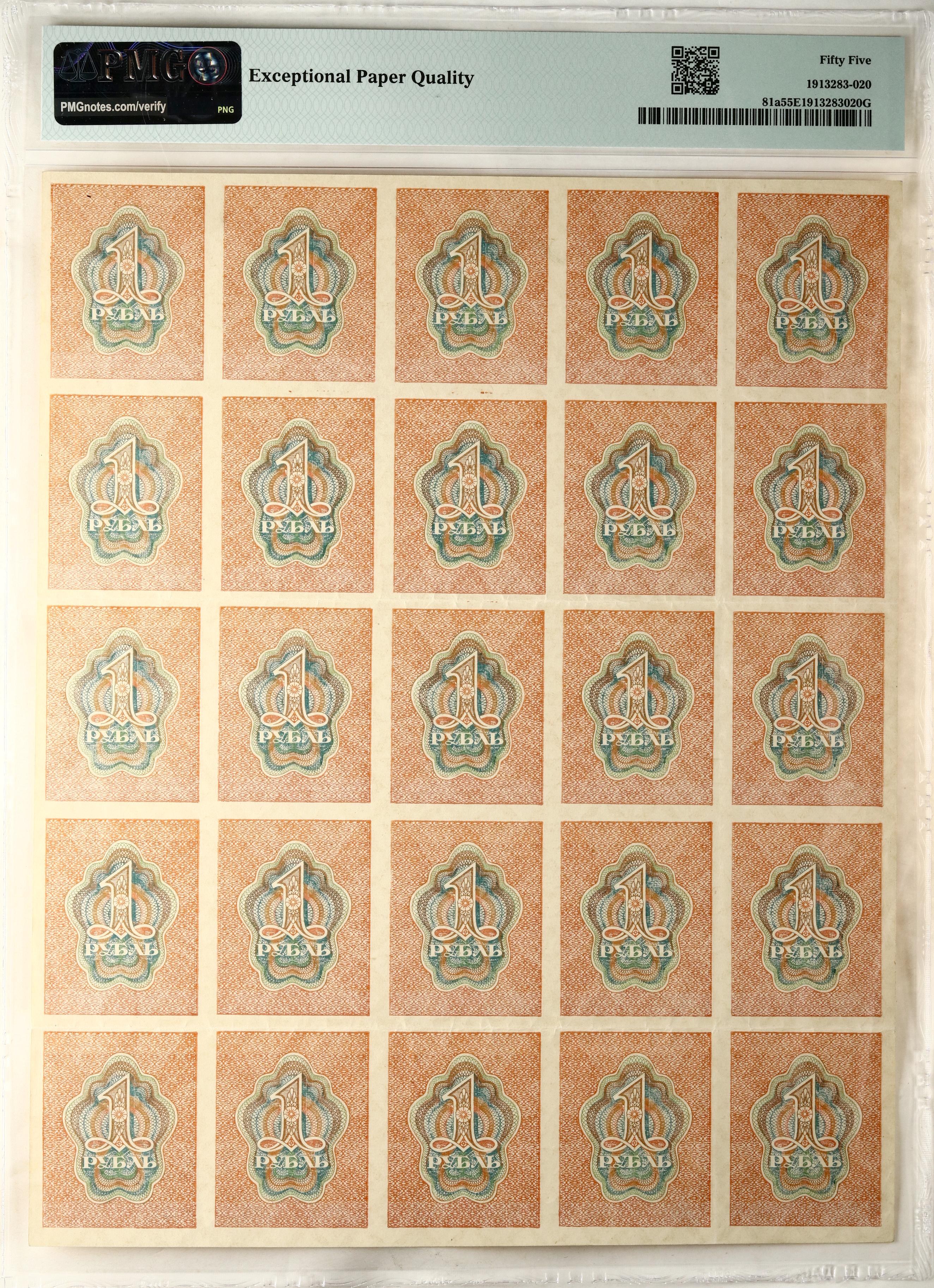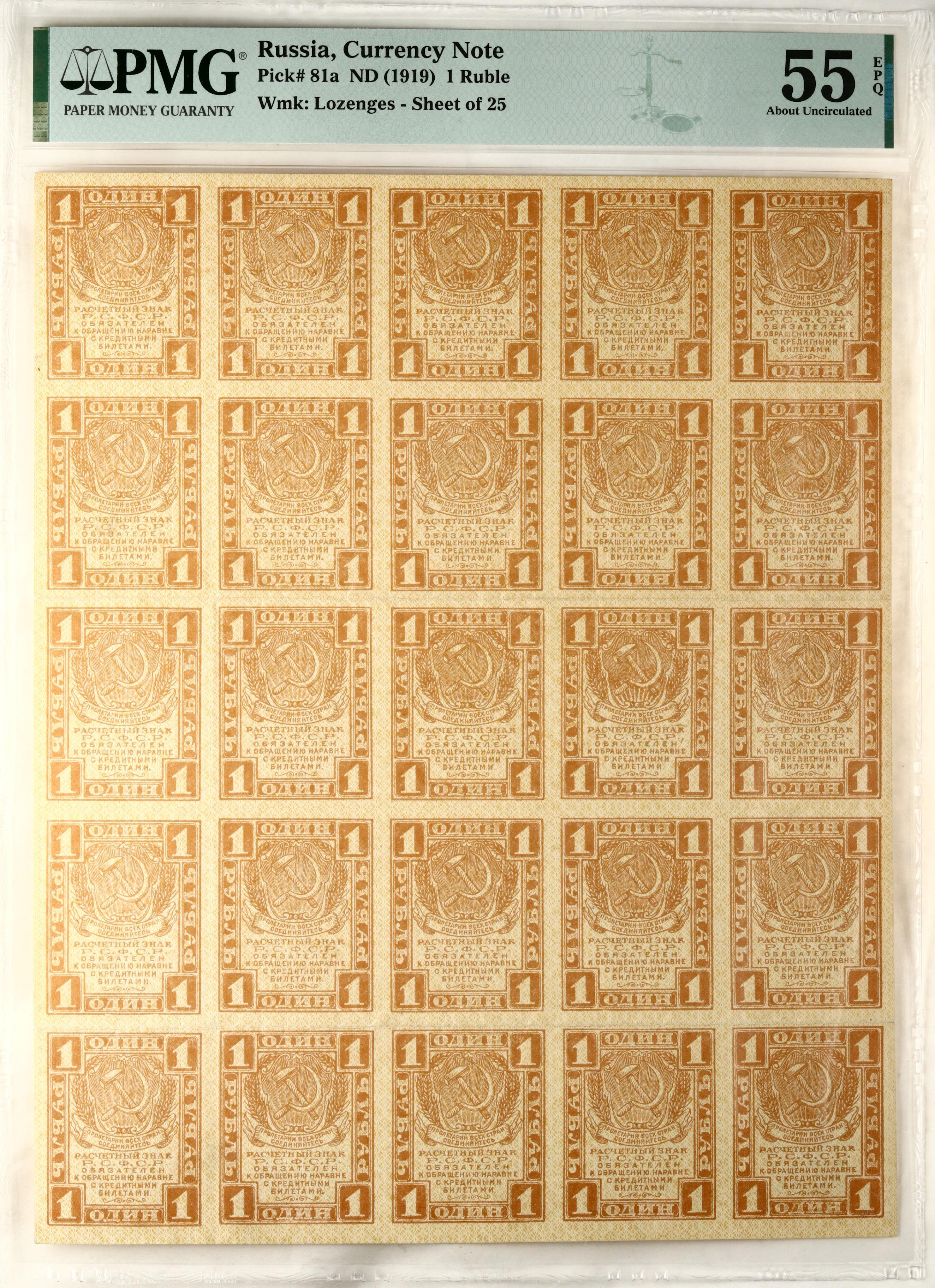 Russia, RSFR. 1 Rouble ND (1919). Pick # 81a. Wmk: Lozenges - Sheet of 25. PMG 55 About Uncirculated EPQ.