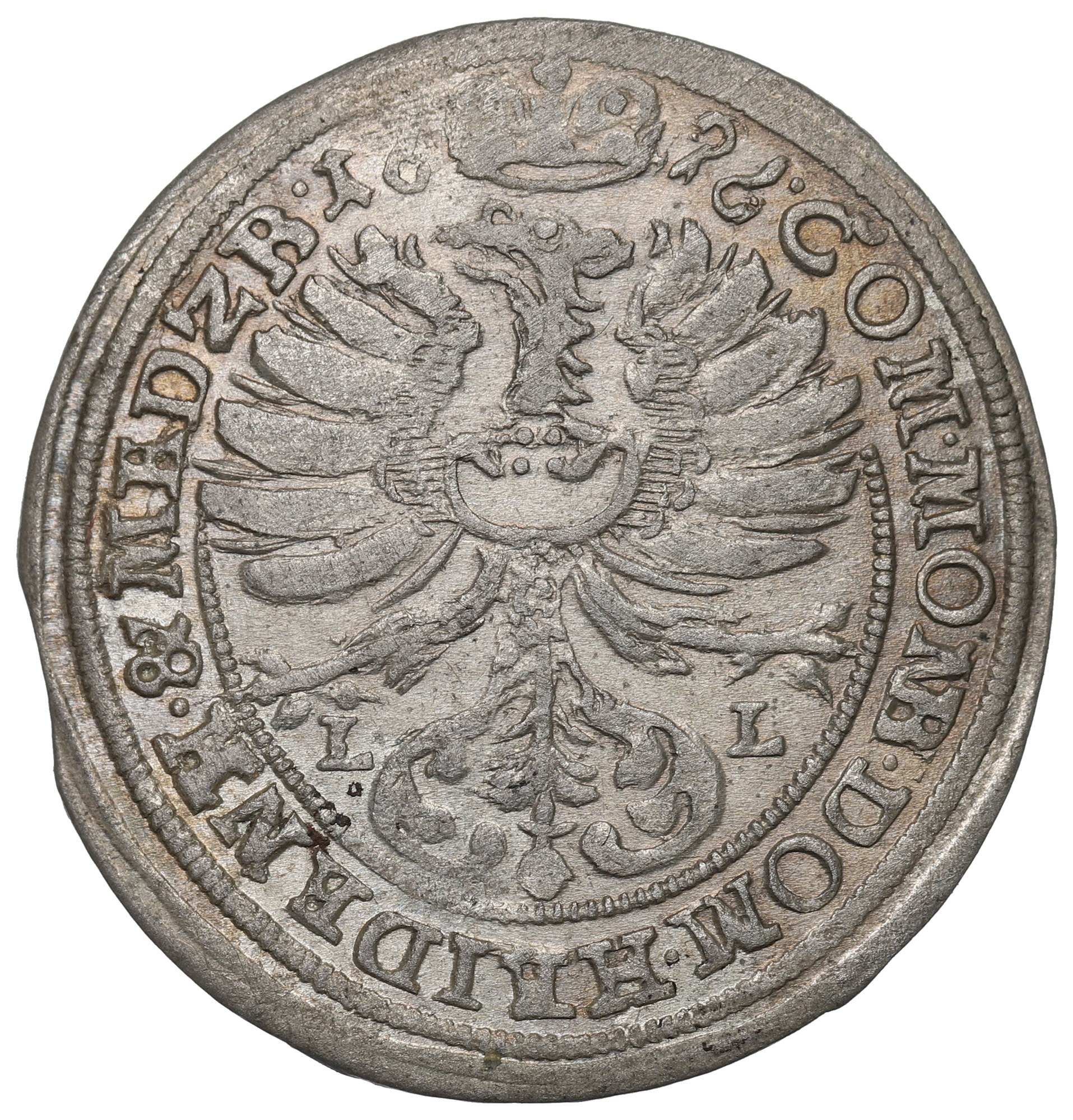 Rewers: W otoku perełkowym orzeł śląski, przy jego łapach inicjały L-L mincmistrza Lukasa Laurentiusa, w otoku zewnętrznym legenda przedzielona mitrą: