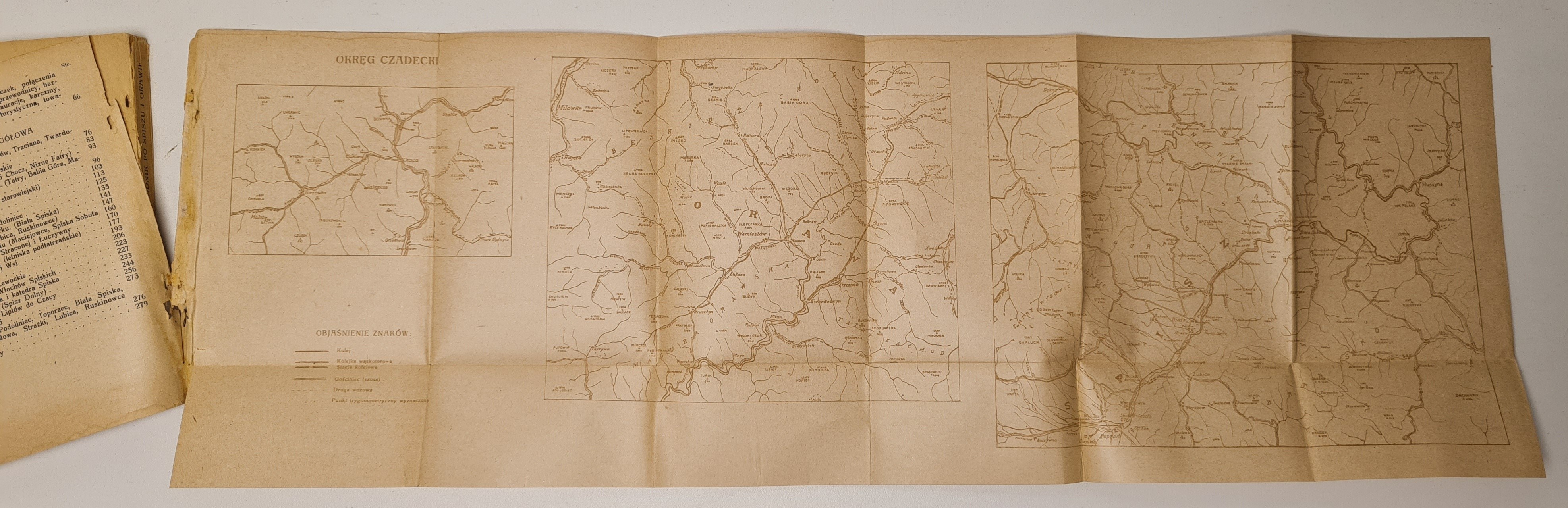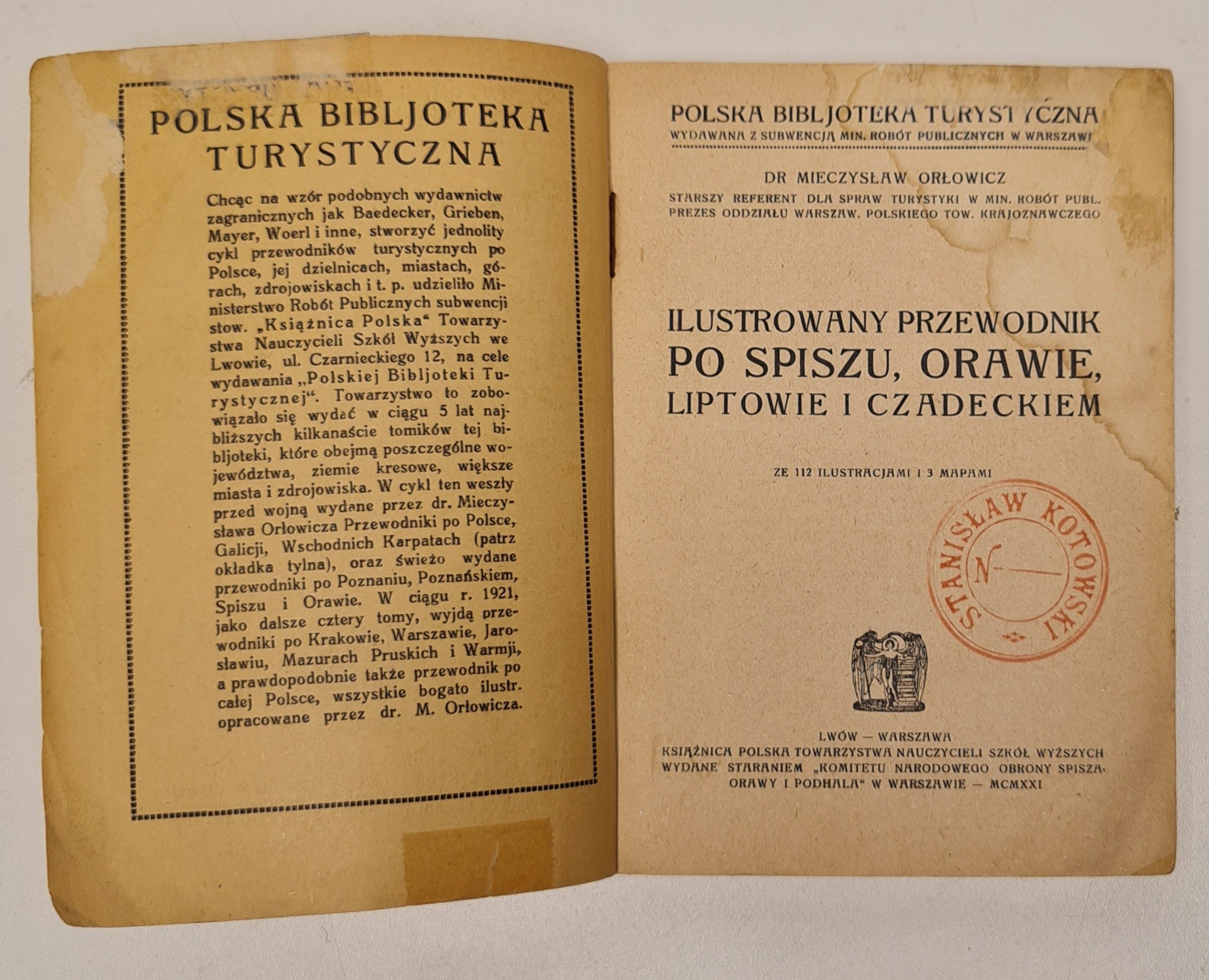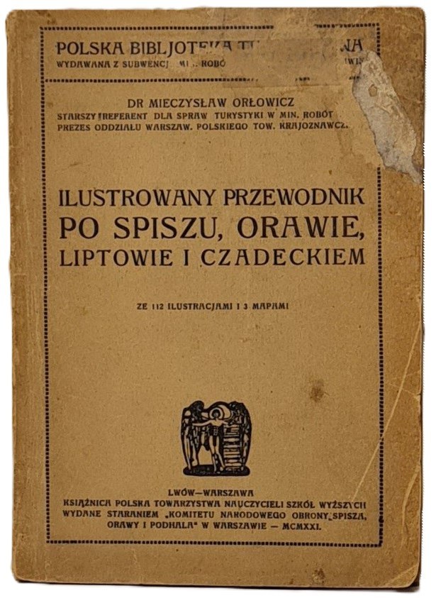 Orłowicz Mieczysław: Ilustrowany przewodnik po Spiszu, Orawie, Liptowie i Czadeckiem. Lwów-Warszawa 1921: Książnica Polska, 1921. Wym. 11,5x16cm, 288 s., il., [1] mapa rozkł., 16,5 cm, brosz. wyd. Na k. tyt. pryw. pieczątka własnościowa. Polska Bibljoteka Turystyczna. Na końcu indeks alfabetyczny nazw miejscowości. Pierwsze karty ze śladem po zacieku i z niewielkim ubytkiem marginesu. Okładka lekko zabrudzona z zagięciami na krawędziach, tylna okładka osobno od bloku.