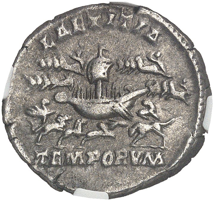Rv. LAETITIA TEMPORVM. La Spina du Grand Cirque décorée par un navire à gauche, quatre quadriges à gauche au-dessus ; et des animaux en bas (autruche, lion, lionne, panthère, etc.).