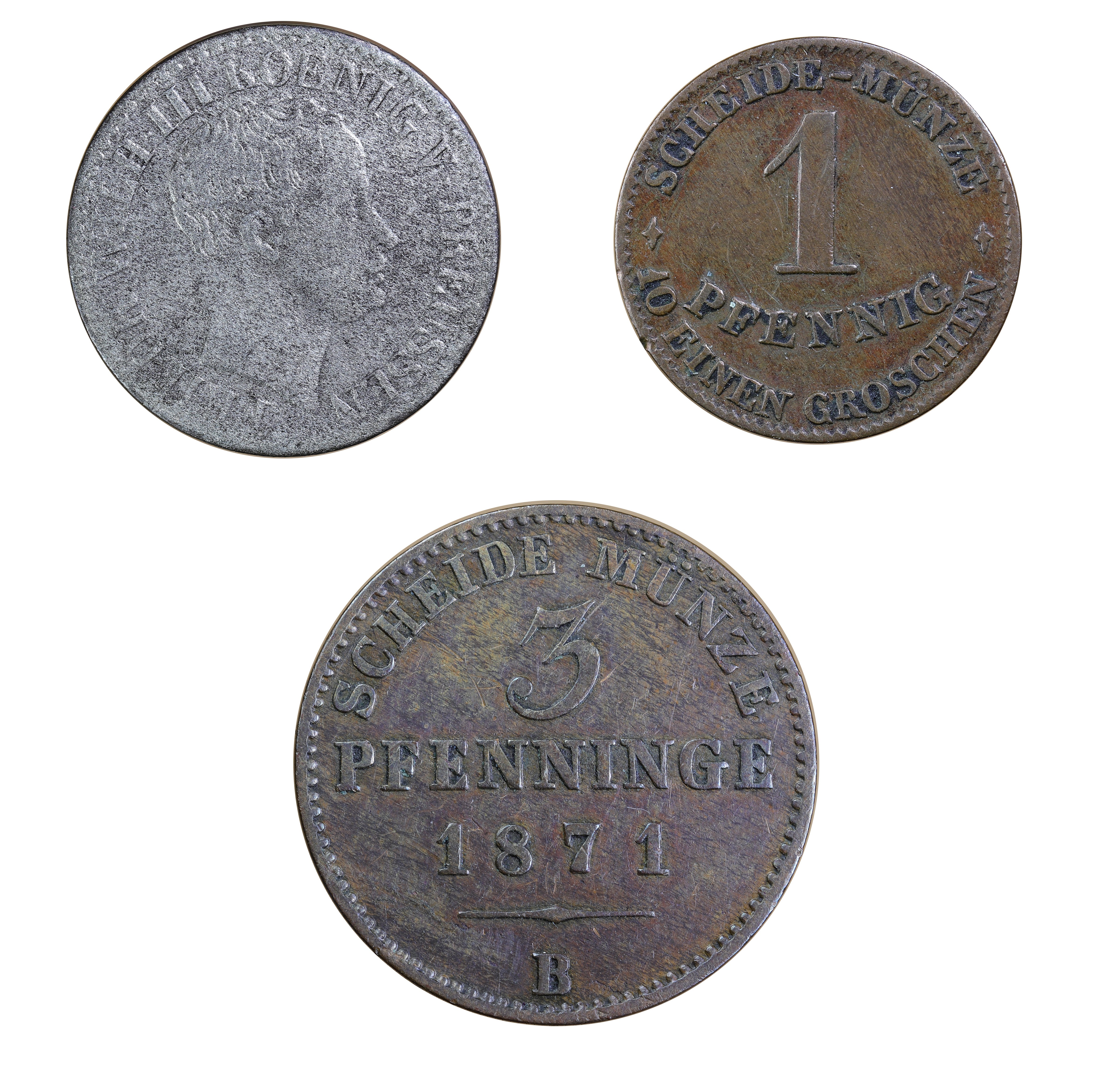 Zestaw zawiera: 3 fenigi 1871 B - Prusy; 1/2 srebrnego gosza 1836 A - Prusy; 1 fenig (1/10 grosza) 1865 r. - Saksonia