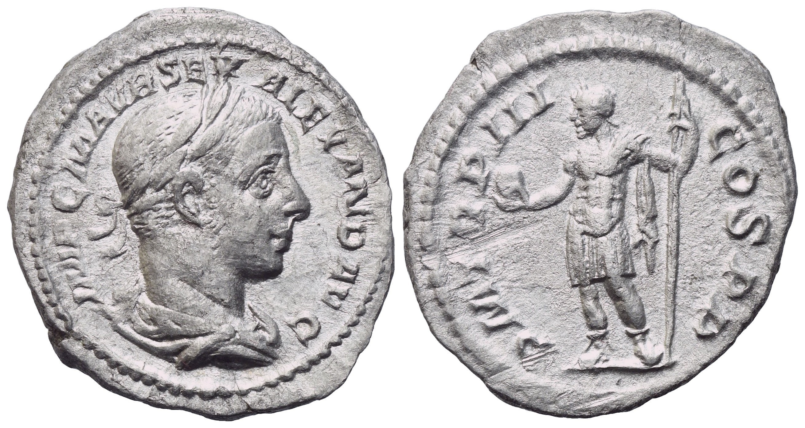 IMP C M AVR SEV ALEXAND AVG  Laureate draped bust r.; Rv. PM TRP III COS PP Emperor standing l holding globe and sceptre. RIC 44. Good very fine.