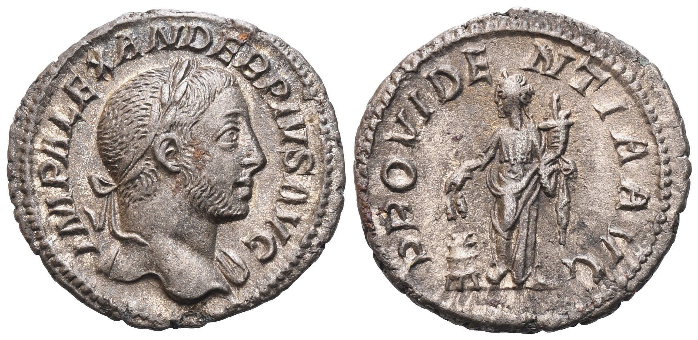 IMP ALEXANDER PIVS AVG  Laureate head r.; Rv. PROVIDENTIA AVG  Providentia standing front, head to l., holding two grain ears in her r. hand and cornucopia with her l.; on ground to l., modius. RIC 250. Near extremely fine.