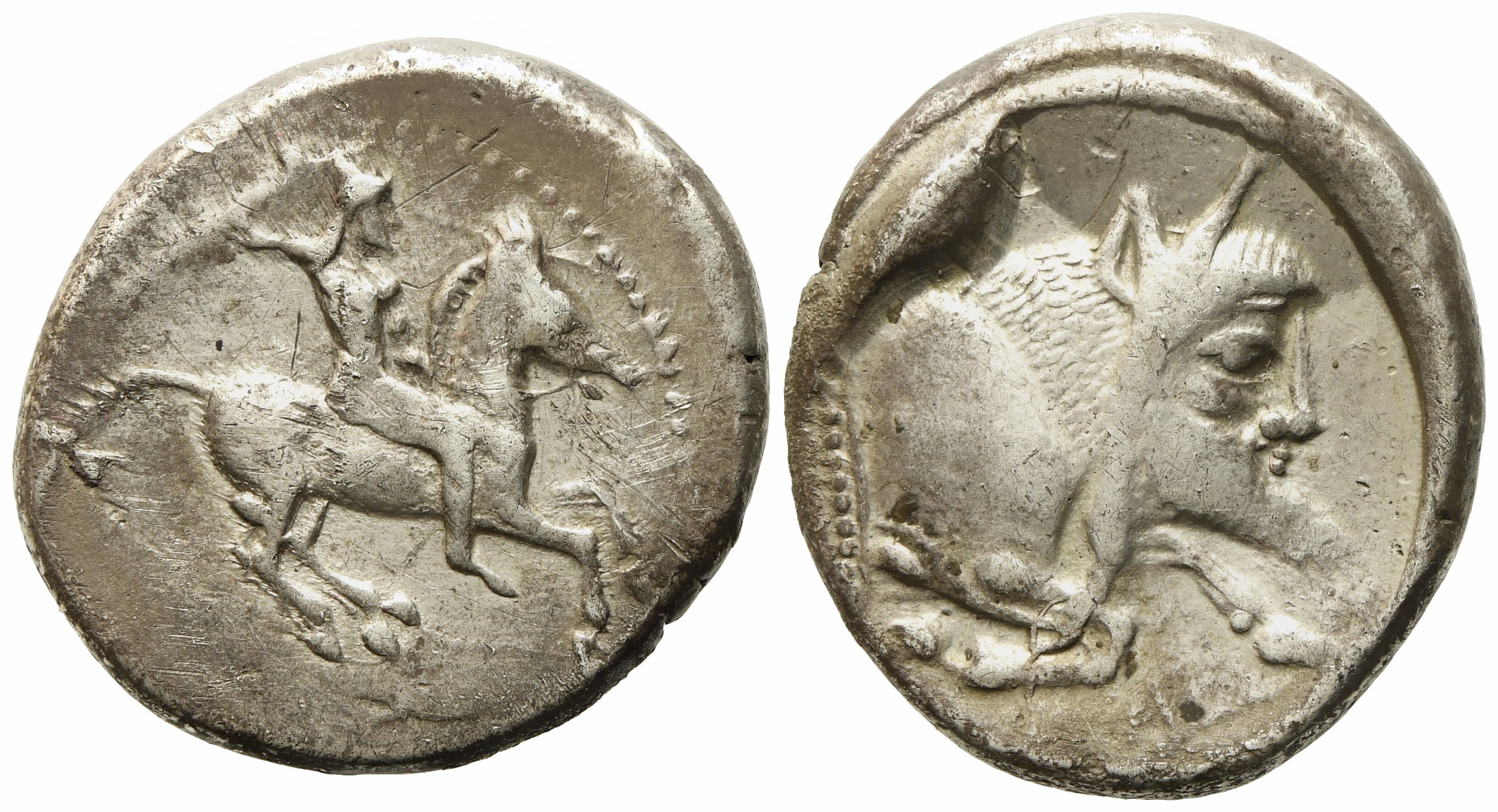 Warrior on horseback galloping right, preparing to cast javelin; Rv. [CEΛA], forepart of man-headed bull r. within circular incuse. SNG ANS 4. Good VF
