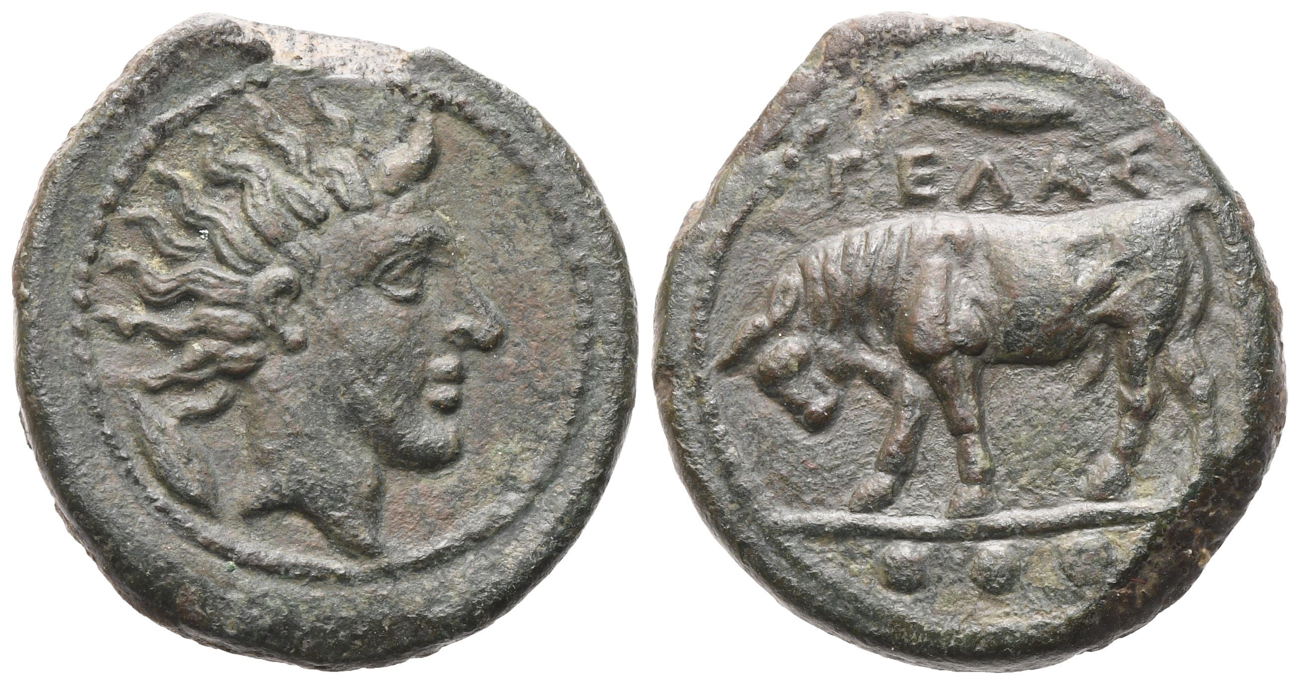 Bull standing leftl. olive leaf and ΓEΛAΣ above, ••• (mark of value) in exergue; Rv. Horned head of Gelas right; barley grain to l. Calciati, III, p. 17, 32. Jenkins, Gela 516; SNG ANS 115. Dark brown and green patina. Good very fine.
