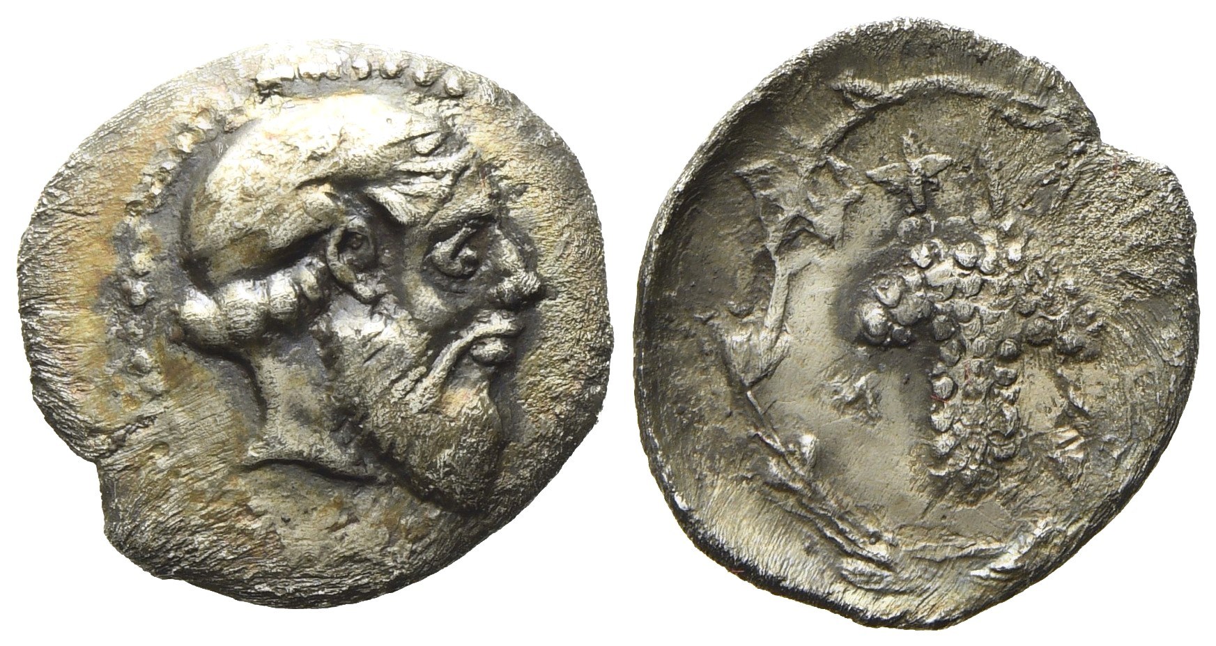 Wreathed head of Dionysos r. / N-A-X-I, grape cluster on vine. Cahn 70 (V52(?)/R58); SNG ANS 522. Porosity, some roughness, otherwise near extremely fine / good very fine.