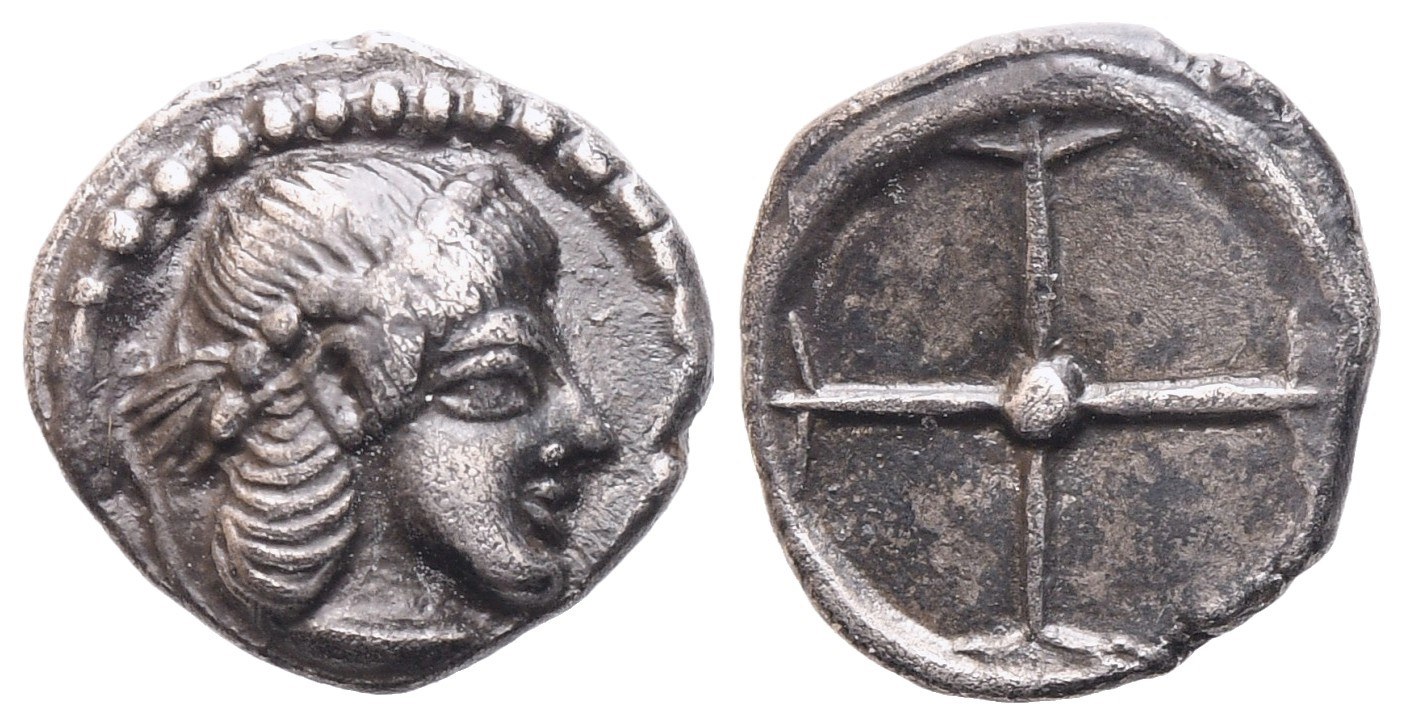 Head of Arethusa r. wearing beaded diadem; Rv. Wheel with four spokes. Boehringer 370a (43 spec.); Sear 917. Good extremely fine.