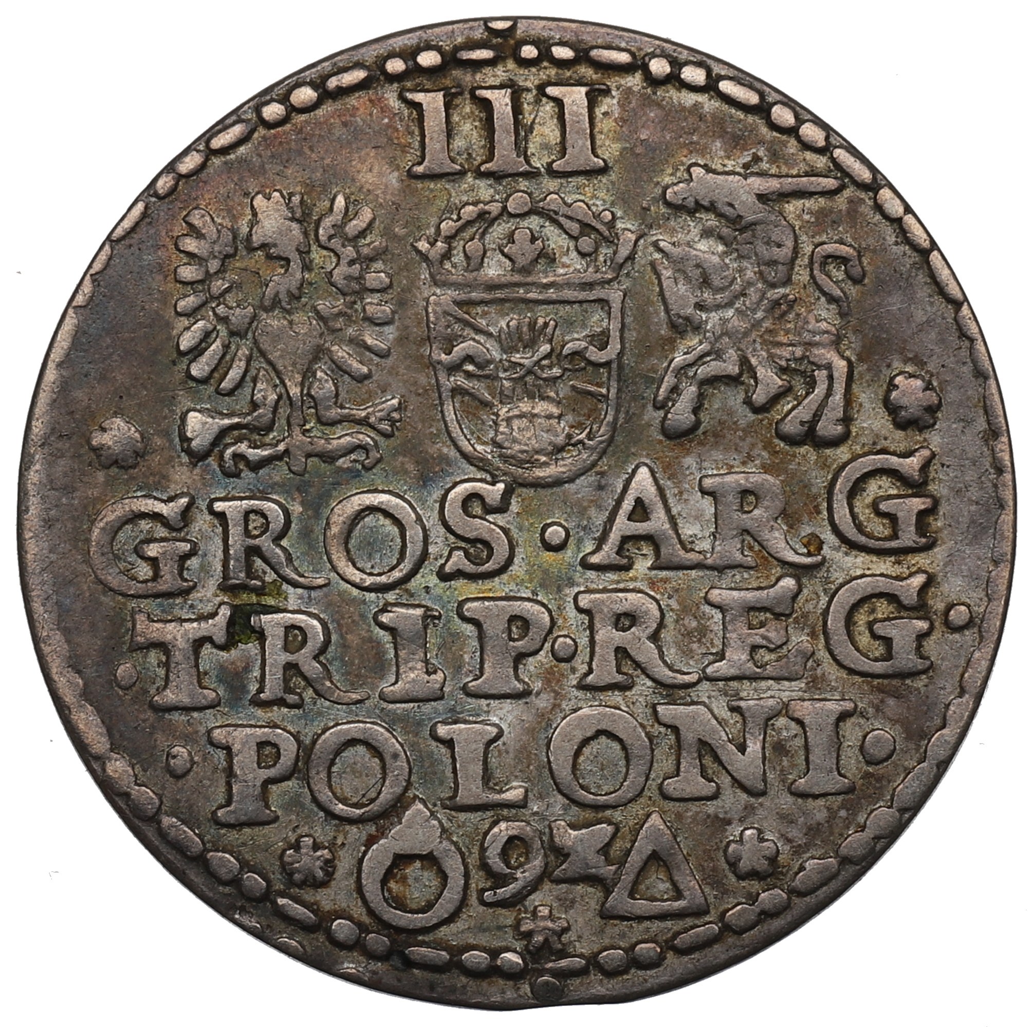 GROS•ARG/•TRIP•REG•/•POLONI•, pod nią skrót daty 92 i znaki mennicze pierścień i trójkąt mincerzy Goebla i Gonzalo między ozdobnikami